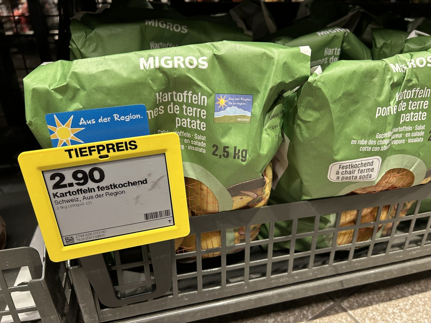 Die M-Budget-Kartoffeln Schweiz, festkochend, ungewaschen, kosten 11 Rappen/100 g – also gleich viel wie die «Save Food»-Kartoffeln –, ausser, dass die «Save Food»-Kartoffeln den Vorteil haben, dass sie gewaschen sind.
