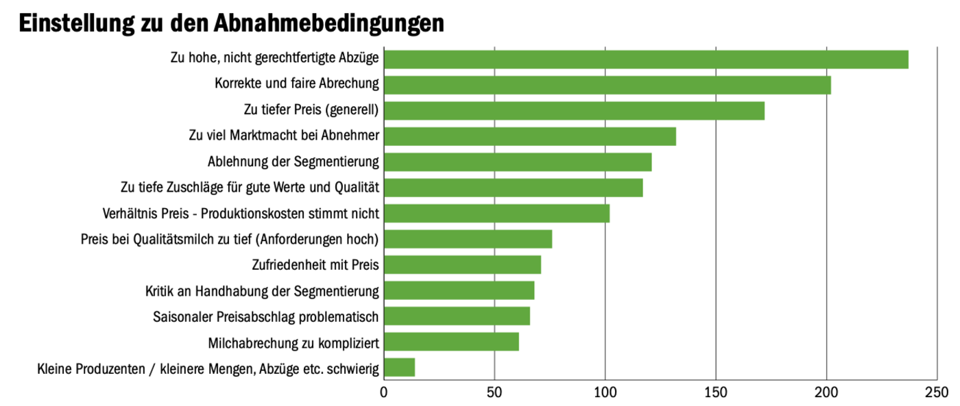 Es gibt aber auch Produzenten, welche die Meinung ihrer Verbandsspitze teilen. Immerhin neunzig Mal gaben von der Uni Bern Befragte an, die Segmentierung sei eine gute Lösung, die den teilliberalisierten Markt stabilisiere. Die Westschweizer(innen) zeigten sich deutlich kritischer, nur zwei der positiven Äusserungen zur Segmentierungslösung kamen aus diesem Landesteil – obwohl Westschweizer Betriebe gemäss Studie eher höhere Milchpreise erzielen.