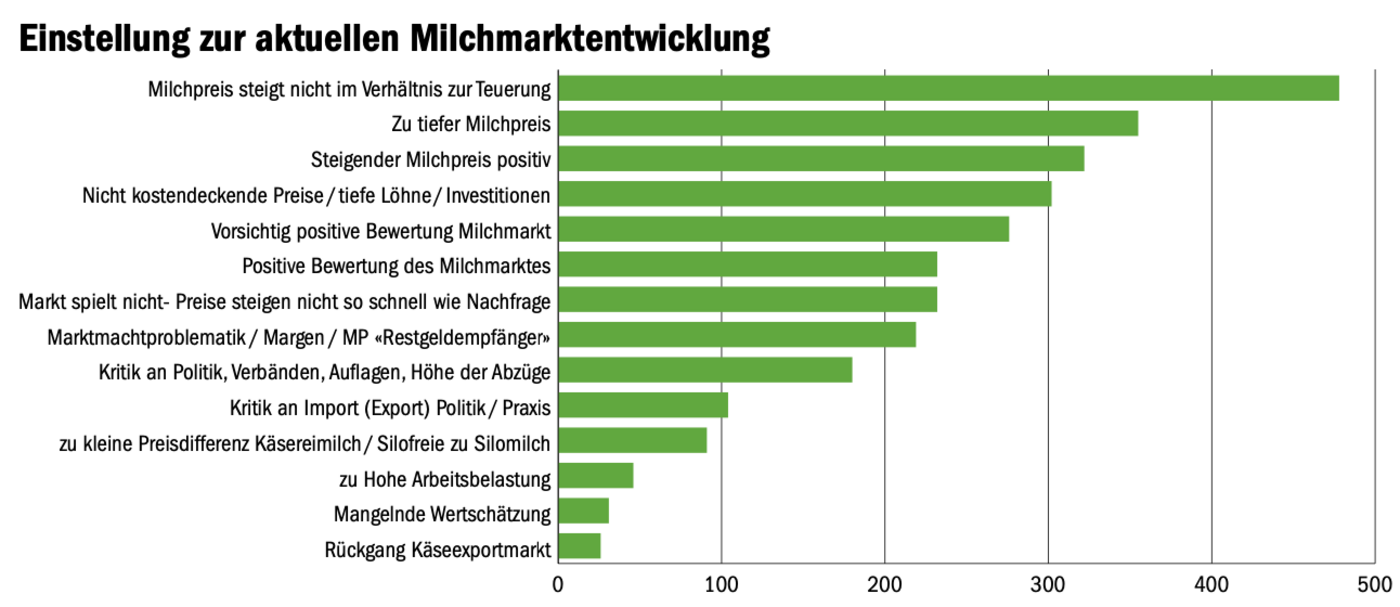 Tatsächlich wurde die Segmentierung 2011 mit dem Ziel eingeführt, Transparenz zu schaffen und die Milchpreise zu regulieren. Sie sollte laut der Branchenorganisation Milch (BOM) den Produzenten als wichtige Entscheidungsgrundlage für die Mengenplanung dienen und so verhindern, dass Überschüsse wertschöpfungsstarke Märkte – und damit letztlich die Produzentenpreise – bedrohen. «Die Segmentierung ist ein Instrument, das bei zu grosser Milchmenge eingeführt worden ist», so ein Teilnehmer in der Umfrage der Uni Bern, und weiter: «Mittlerweile ist es ein Instrument dafür, den Milchpreis zu drücken.» Es wurde auch explizit kritisiert, die Segmentierung sei bei der aktuellen Marktsituation der Milchknappheit weder gerechtfertigt noch nötig.
