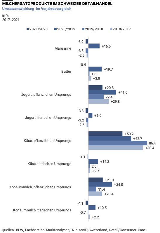 Von 2017 bis 2021 stieg der Umsatz mit Milchähnlichen Produkten wie z. B. Haferdrink oder Käseimitat aus Nüssen um knapp 80 Prozent auf 172 Millionen Franken. Ein beeindruckendes Wachstum, das das Bundesamt für Landwirtschaft (BLW) in seiner Marktanalyse verzeichnet. Allerdings bleibt dieses Segment mit 4,2 Prozent Marktanteil im Detailhandel nach wie vor eine Nische.