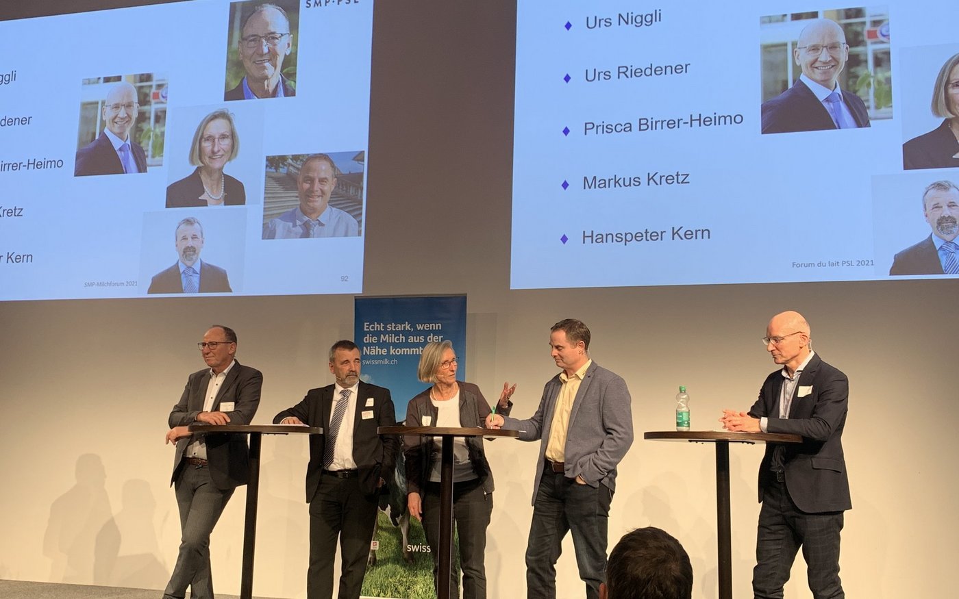 Der Anlass wurde mit einer Podiumsdiskussion abgerundet. Welche Milch brauchen wir für die Zukunft? Wie zeigt sich der Einfluss der Nachhaltigkeitsdebatte in der Wertschöpfungskette Milch? Über diese Themen diskutierten die vier Referent(innen) zusammen mit Hanspeter Kern, Präsident Schweizer Milchproduzenten. Die Podiumsdiskussion wurde von Josef Scherer geleitet, Chefredaktor der BauernZeitung Region Zentralschweiz und Aargau.