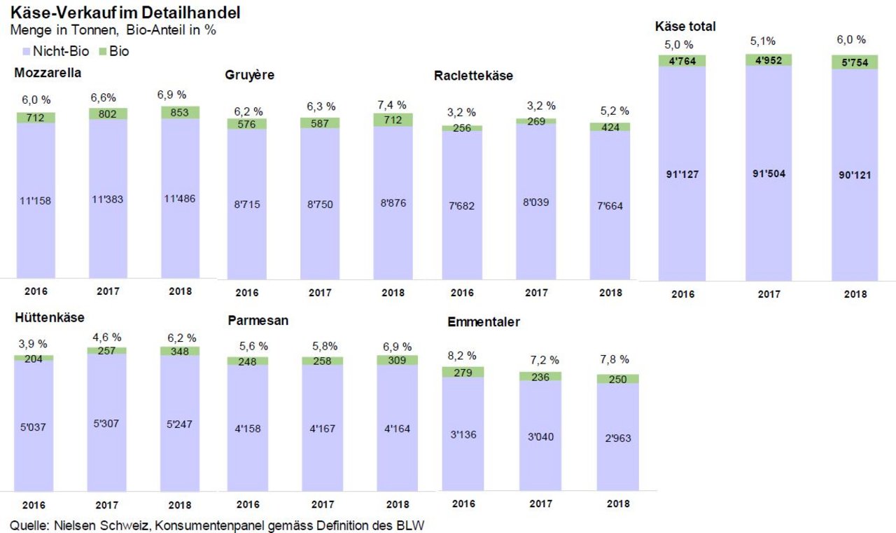 Der Marktanteil erhöhte sich auf 6 Prozent der Verkaufsmenge von Käse, wie der BLW-Fachbereich Marktanalyse im aktuellen Marktbericht Bio schreibt. Im selben Zeitraum sanken die Verkäufe von Nicht-Bio-Käse um 1,1 Prozent. Umsatzmässig steigerte Bio-Käse den Marktanteil von 6,5 auf 7,9 Prozent.