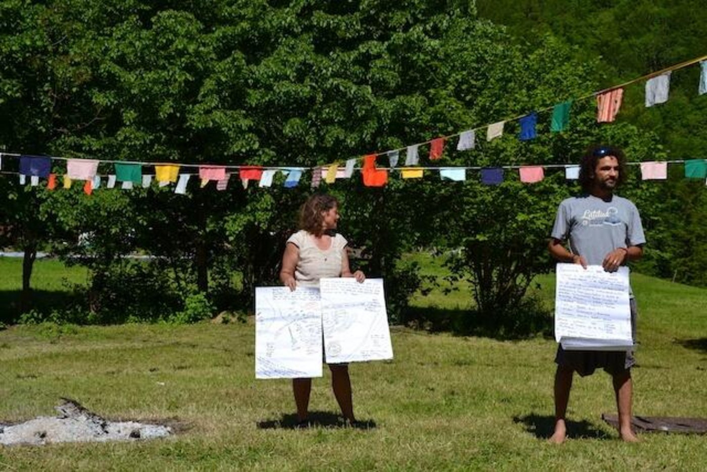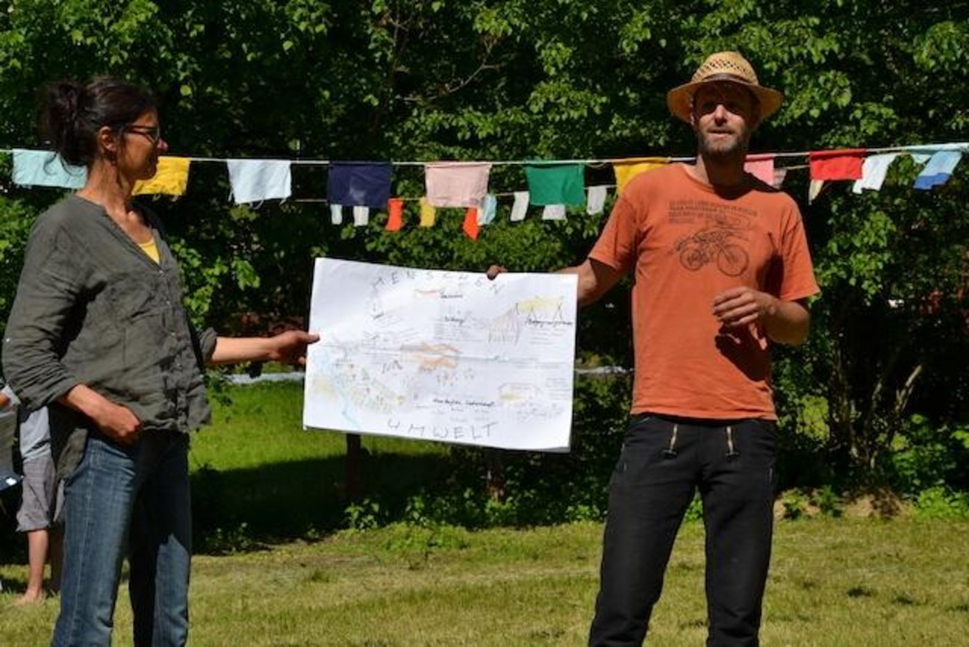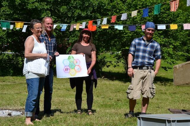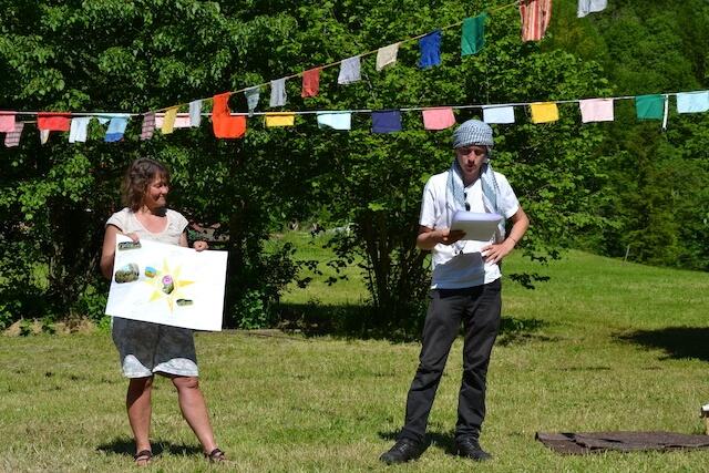 Auch der Verein Familienlandsitze Schweiz präsentierte eine Projektidee. Inspiriert vom Gedankengut der sibirischen Einsiedlerin Anastasia hatte die Gruppe «Siedler» dieses Vereins auf ihrem Plakat ihre Werte in der Form von Sechsecken aufgemalt. Per Definition seien Familienlandsitze etwa eine Hektare gross, zentriert um einen «Urhof» (in diesem Fall wäre das Masesselin) und verbunden mit den Gemeinden und Dörfern der Umgebung, erklärte Ursula. Auch wichtig sei eine integrale Umsetzung der Permakultur-Grundsätze, Bildung und Forschung und Feste. Zum Schluss der Präsentation wurden die vorgestellten Visionen dieser Gruppe mit einem Jodel-Lied kurz vertont.