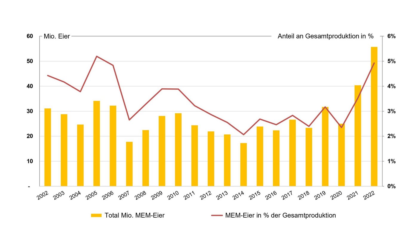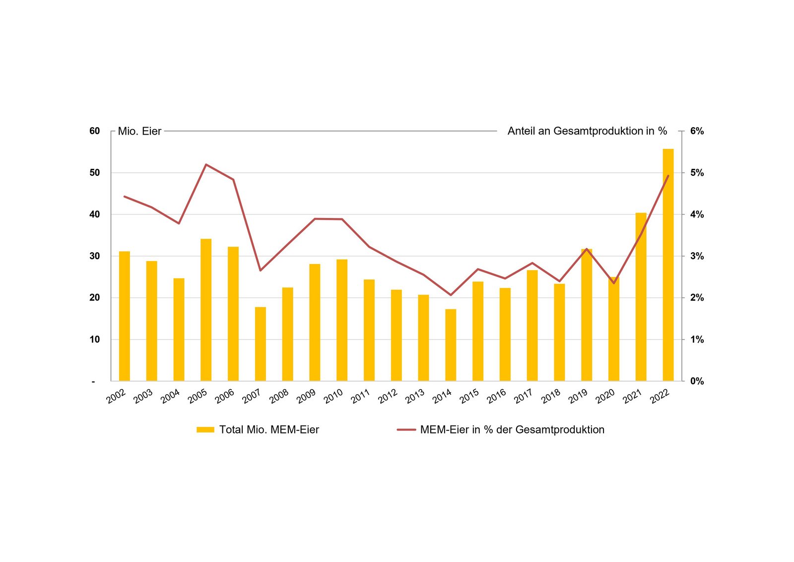 Seit der Coronaviruspandemie ist der Eiermarkt aus dem Lot geraten: Sowohl 2020 als auch 2021 war die Nachfrage nach Konsumeiern im Detailhandel aufgrund der ausserordentlichen Lage stark erhöht und die Schweizer Eierproduzentinnen und Eierproduzenten waren zum Teil nicht mehr in der Lage, die Nachfrage zu decken. Insbesondere 2020 mussten deshalb deutlich mehr Eier importiert werden, da die hiesige Eierproduktion kurzfristig nicht erhöht werden konnte.