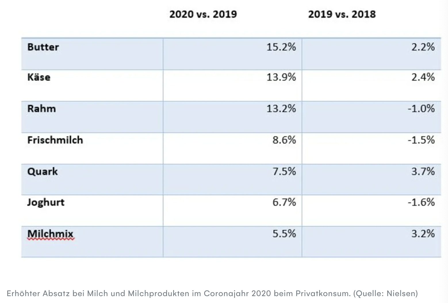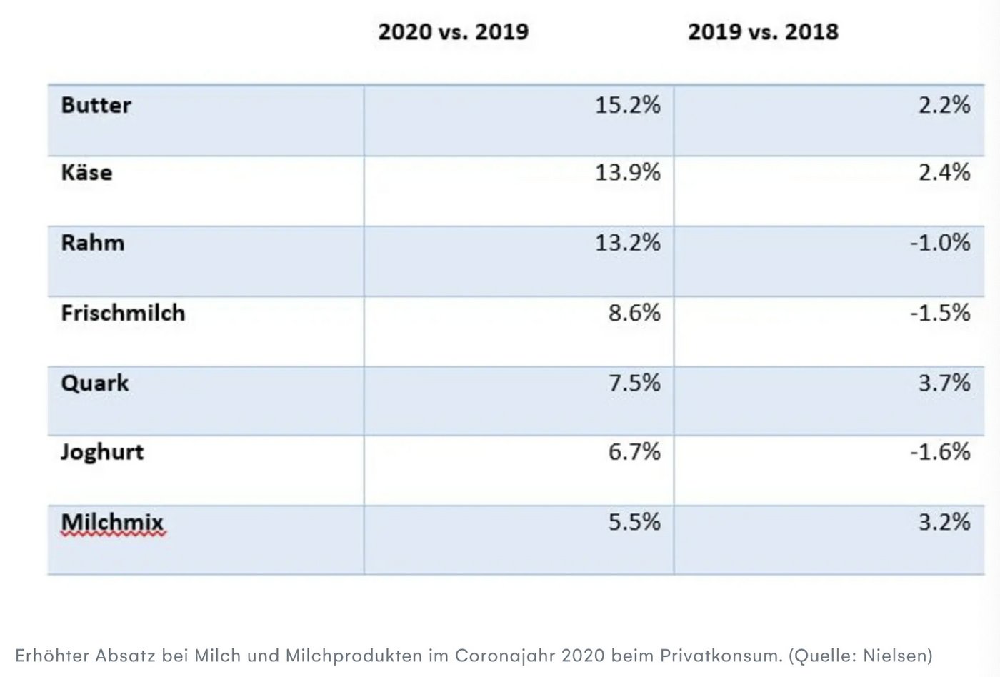 Rekordverdächtig sei unter anderem der Absatz von Butter: Dieser habe um 15 Prozent gegenüber Vorjahr zugelegt, schreibt der Verband der Schweizer Milchproduzenten (SMP) in einer Mitteilung. Im Vergleich dazu sei der Butterabsatz 2019 gegenüber 2018 nur um 2,2 Prozent gestiegen. Auch die Entwicklung von Frischmilch sei interessant zu beobachten gewesen: Im Januar 2020 habe Frischmilch noch einen Absatzrückgang von 1 Prozent verzeichnet. Schon im März, also während des ersten Lockdowns, habe der Absatz aber mit rund 24 Prozent gegenüber dem Vorjahresmonat zugenommen, schreibt die SMP weiter.