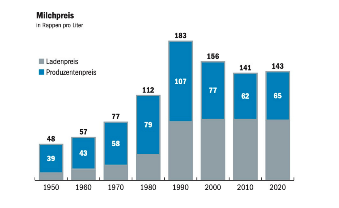 Obwohl der Produzentenpreis für Milch seit 1990 mehrheitlich abnahm, blieb der Preis fürdie Verarbeitung mehr oder weniger gleich hoch. Ein Meilenstein in der Geschichte des Milchpreises war der staatlich garantierte Milchpreis ab 1952. 1979 wurde die Milchkontingentierung eingeführt.