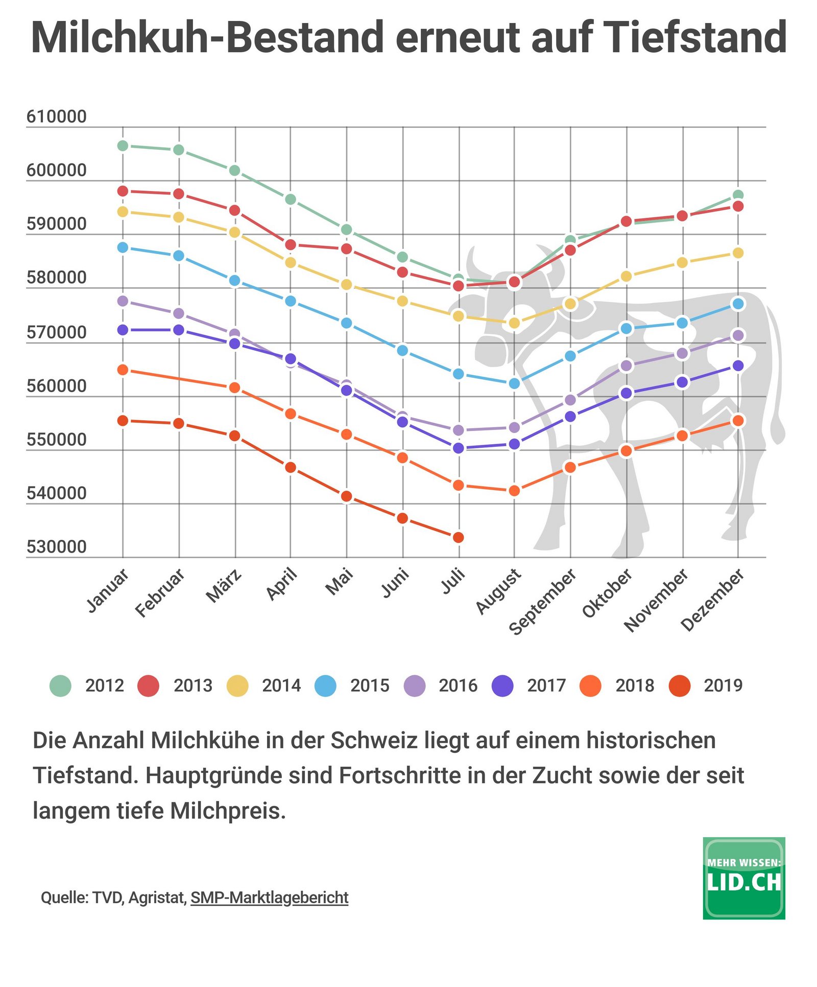 Im Juli 2019 waren in der Schweiz 533 495 Milchkühe registriert. Gegenüber dem Vorjahresmonat hat sich der Bestand um 2% verringert, im Vergleich zu Juli 2012 sogar um 9%. Damit ist ein absoluter Tiefstand seit Beginn der Aufzeichnungen erreicht.