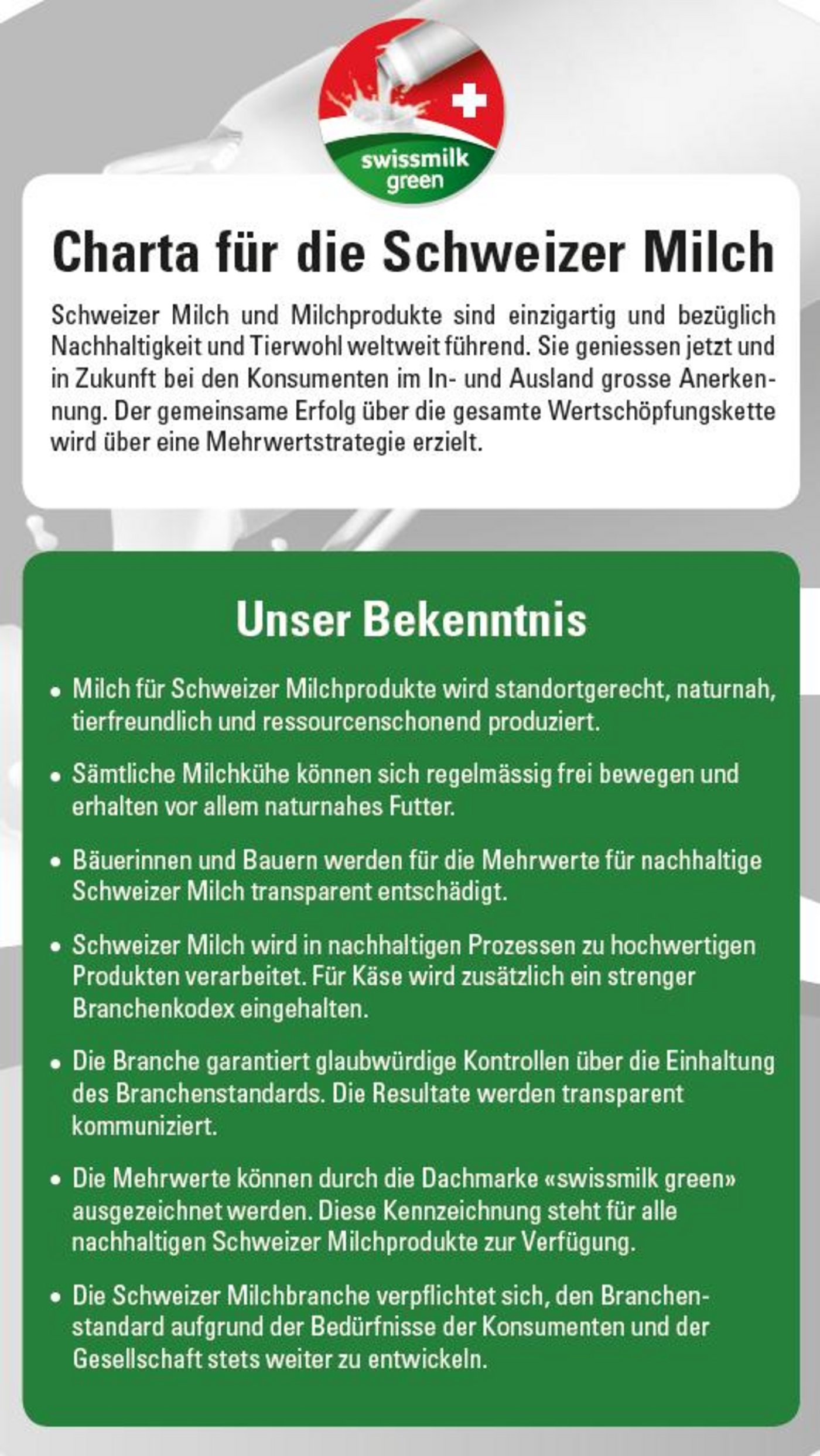 Swissmilk Green basiert auf der Charta für Schweizer Milch, die bisher von rund 40 Organisationen aus der Land- und Milchwirtschaft unterzeichnet wurde.