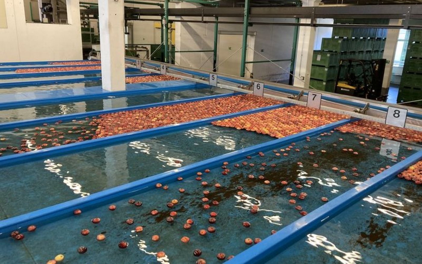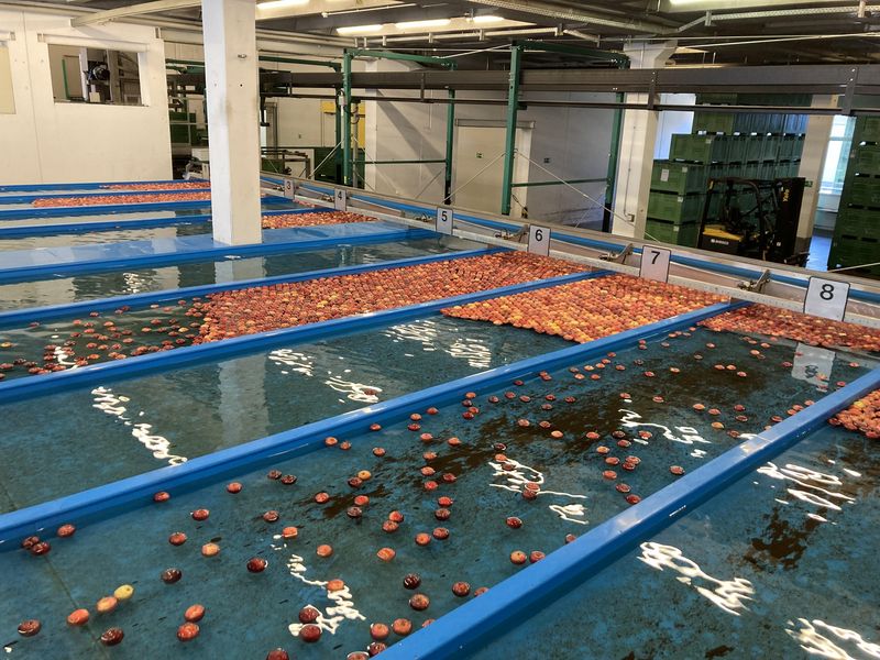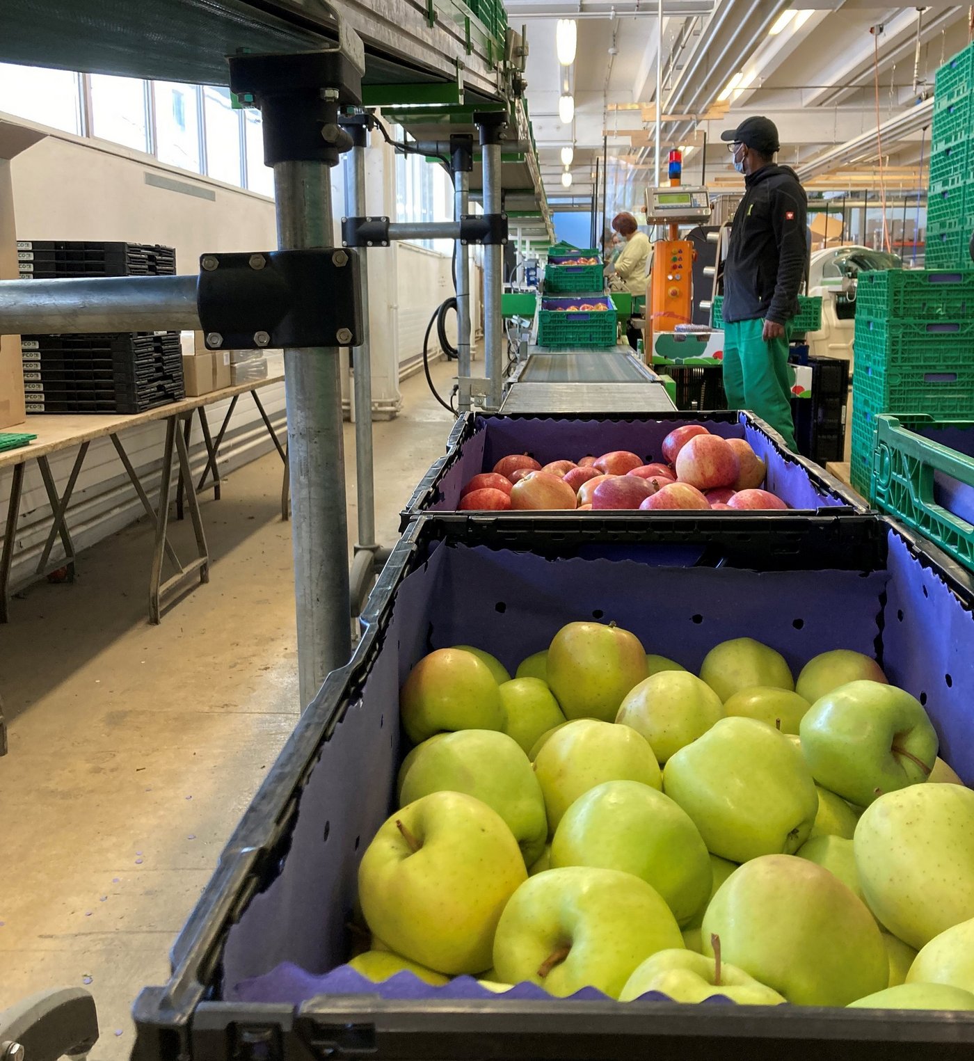 Im luzernischen Sursee steht eine solche Obsthalle, in der jeweils tausende Äpfel unter kontrollierten Bedingungen eingelagert werden. Das System ist von Anfang bis Schluss durchgetaktet: Während der Erntezeit meldet jede Obstproduzentin und jeder -produzent 24 Stunden vorher an, welche Sorten und welche Mengen geerntet und in der Obsthalle abgeliefert werden, wo sie dann in den diversen Kühlräumen eingelagert werden. In diesen Räumen herrschen fast schon widrige Konditionen: niedrige Temperaturen, tiefer Sauerstoff- und dafür erhöhter CO2-Gehalt. Der auf ein bis drei Prozent abgesenkte Sauerstoffgehalt, der gesteigerte Kohlenstoffdioxidgehalt und die Temperaturen nur knapp über dem Gefrierpunkt verlangsamen den Reifungsprozess der Äpfel, die so quasi auf dem Erntestand konserviert werden können. Jede Saison lagern so gesamthaft mehrere tausend Tonnen von über 20 verschiedenen Apfelsorten in der Obsthalle in Sursee.