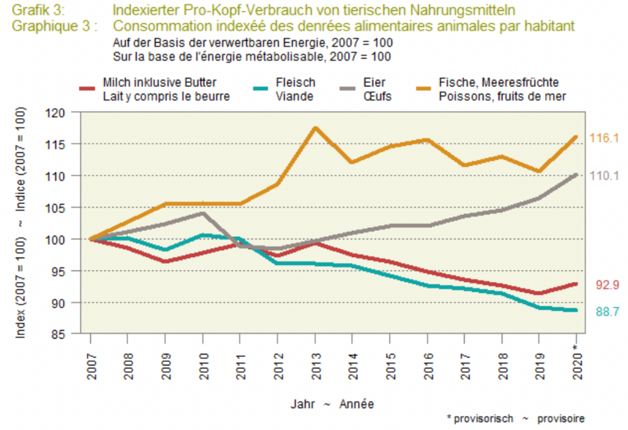 Seit mehreren Jahren sinkt gemäss Agristat der gesamte Pro-Kopf-Verbrauch an Nahrungsmitteln in der Schweiz, was man zumindest teilweise auf den Einkaufstourismus zurückführt. Ungefähr ab 2016 sinke der Verbrauch tierischer Produkte stärker als jener von pflanzlichen. Wenn die Einzelperson weniger Fleisch oder Milch konsumiert, hat das für den Markt kaum folgen, solange der Rückgang mit einer wachsenden Bevölkerung wieder ausgeglichen wird. Aber auch der Gesamtverbrauch tiersicher Lebensmittel sei seit 2016 rückläufig.