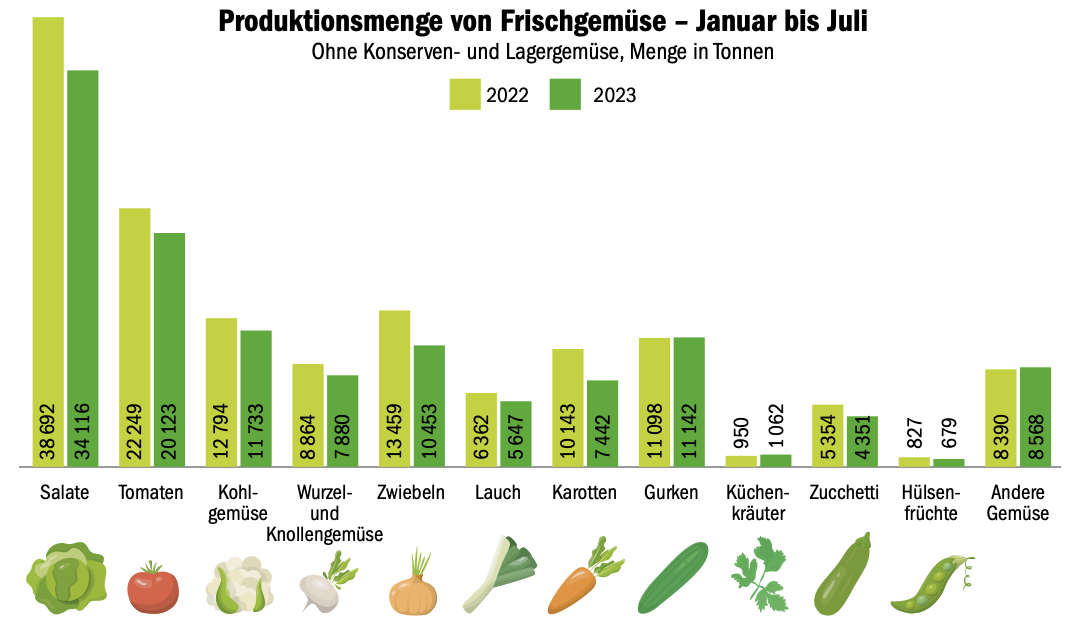 Was unter dem Boden wächst, hat entsprechend noch mehr unter der Nässe zu leiden. So fehlten bis Juli rund ein Viertel der Karottenmenge und ein Fünftel der Zwiebeln. Gurken, die im Treibhaus wachsen, wurden hingegen gleich viel geerntet.