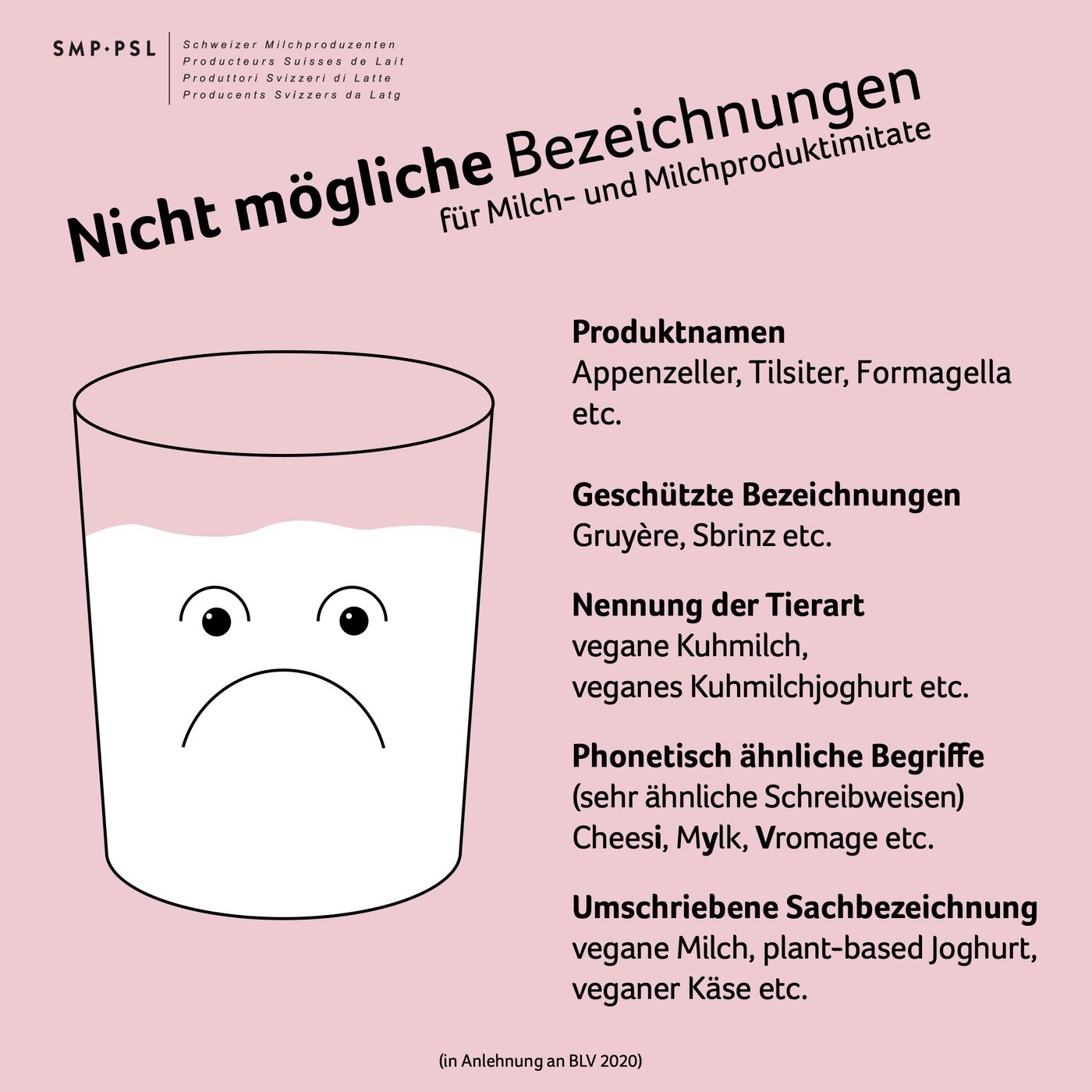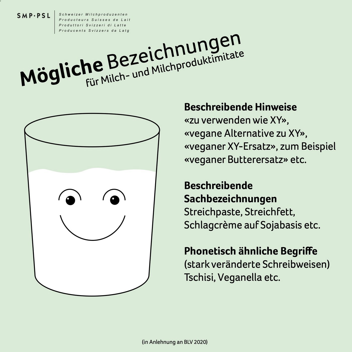 Als Reaktion auf die steigende Zahl veganer Produkte auf dem Markt hat das Bundesamt für Lebensmittelsicherheit und Veterinärwesen (BLV) 2020 in einem Informationsschreiben dargelegt, wie die gesetzliche Grundlage zur korrekten Bezeichnung auszulegen sei. Ziel ist dabei, eine Täuschung des Konsumenten zu verhindern – pflanzliche Produkte müssen von tierischen Originalen zweifelsfrei unterscheidbar sein.