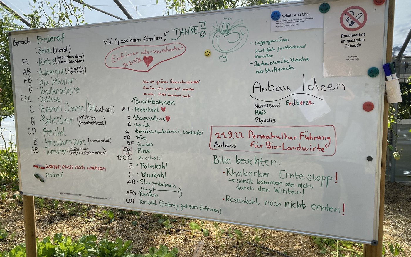 Mit der Betreuung ihrer Abo-Kunden haben die beiden Betriebsleiter wenig zu tun. Eine grosse Tafel im Gewächshaus informiert darüber, was wo zu finden und was erntereif ist. Via Tafel werden Anbauideen für die nächste Saison gesammelt, so haben die Abonnenten auch die Möglichkeit zur Mitbestimmung. «Über eine Umfrage stellen wir dann fest, ob das Interesse gross genug ist und wovon wir als Kompensation weniger anbauen können», erläutert Dario Heller das Vorgehen.