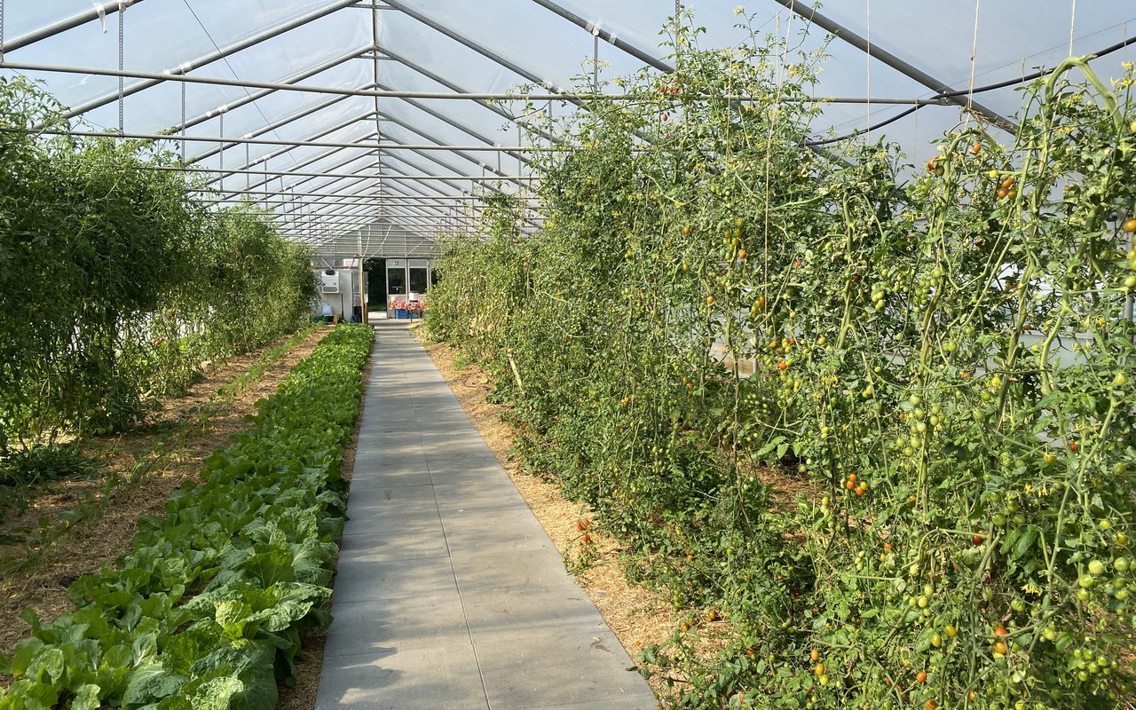 Familie Heller bietet ihren Abonnenten die Möglichkeit auch eigene Projekte zu realisieren. Dies unter der Voraussetzung, dass sie selbst die Verantwortung übernehmen und am Ende alle davon profitieren können. So hat eine 8-köpfige Gruppe in einer feuchten Ecke der von Hecken als Windschutz umstandenen Fläche eine Pilzzucht eingerichtet. «Wir haben Material, das wir gerade zur Hand hatten und das Flüssigmyzel zur Verfügung gestellt», erzählt der Junglandwirt. Tatsächlich konnten einige Edelpilze geerntet werden und der runde Platz mit den grossen Holzkästen wirkt sorgfältig gestaltet und aufgebaut. «Damit schaffen wir auch eine Bindung zu der Fläche», ist Dario Heller überzeugt. Das Gewächshaus selbst wurde zu einem gemütlichen Treffpunkt: Zwischen Tomaten, Peperoni und Kräutern befindet sich ein Aufenthaltsraum mit Holztischen und einem Töggelitisch.