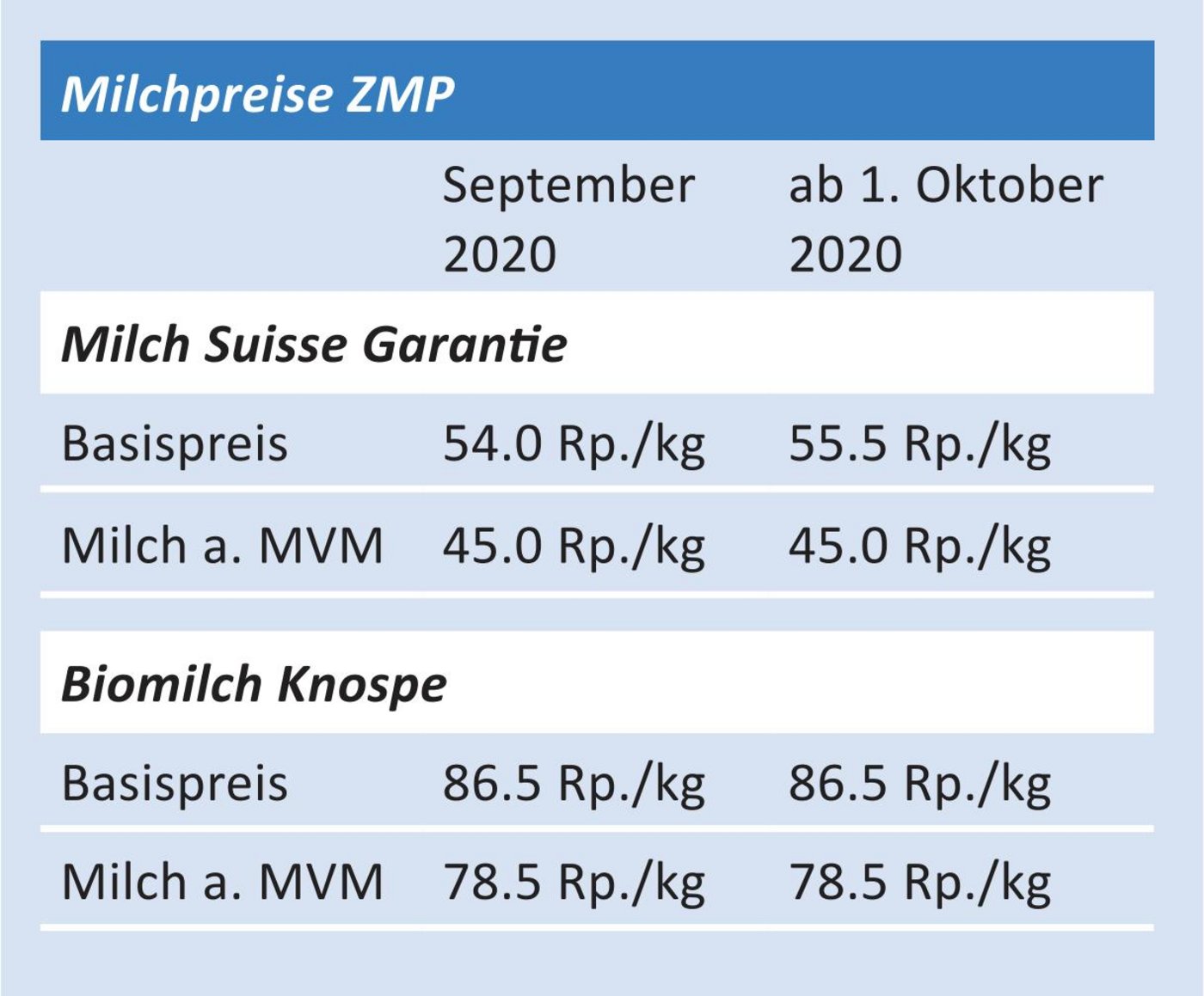 Der Basispreis für Milch Suisse Garantie steigt bei den ZMP per 1. Oktober um 1,5 Rappen auf 55,5 Rappen, dies wegen positiver Entwicklungen im Milchverkauf. Zudem fielen bei den Themen «Importabwehr» und «Schoggigesetz» im Ausblick auf Ende 2020 etwas tiefere Kosten an, als erwartet worden sei. Der Preis ausserhalb der Monatsmenge bleibe im Oktober unverändert.