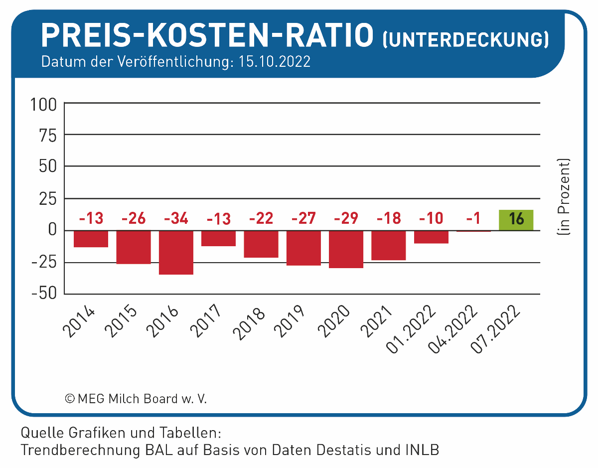 Das Büro für Agrarsoziologie und Landwirtschaft (BAL) beziffert die Produktionskosten für Milch in Deutschland Stand Juli 2022 mit 47,31 Cent/kg. Der durchschnittliche Auszahlungspreis liege bei 55,04 Cent/kg – die Kosten sind also erstmals seit Beginn der vierteljährlichen Kostenstudien im Jahr 2014 gedeckt.