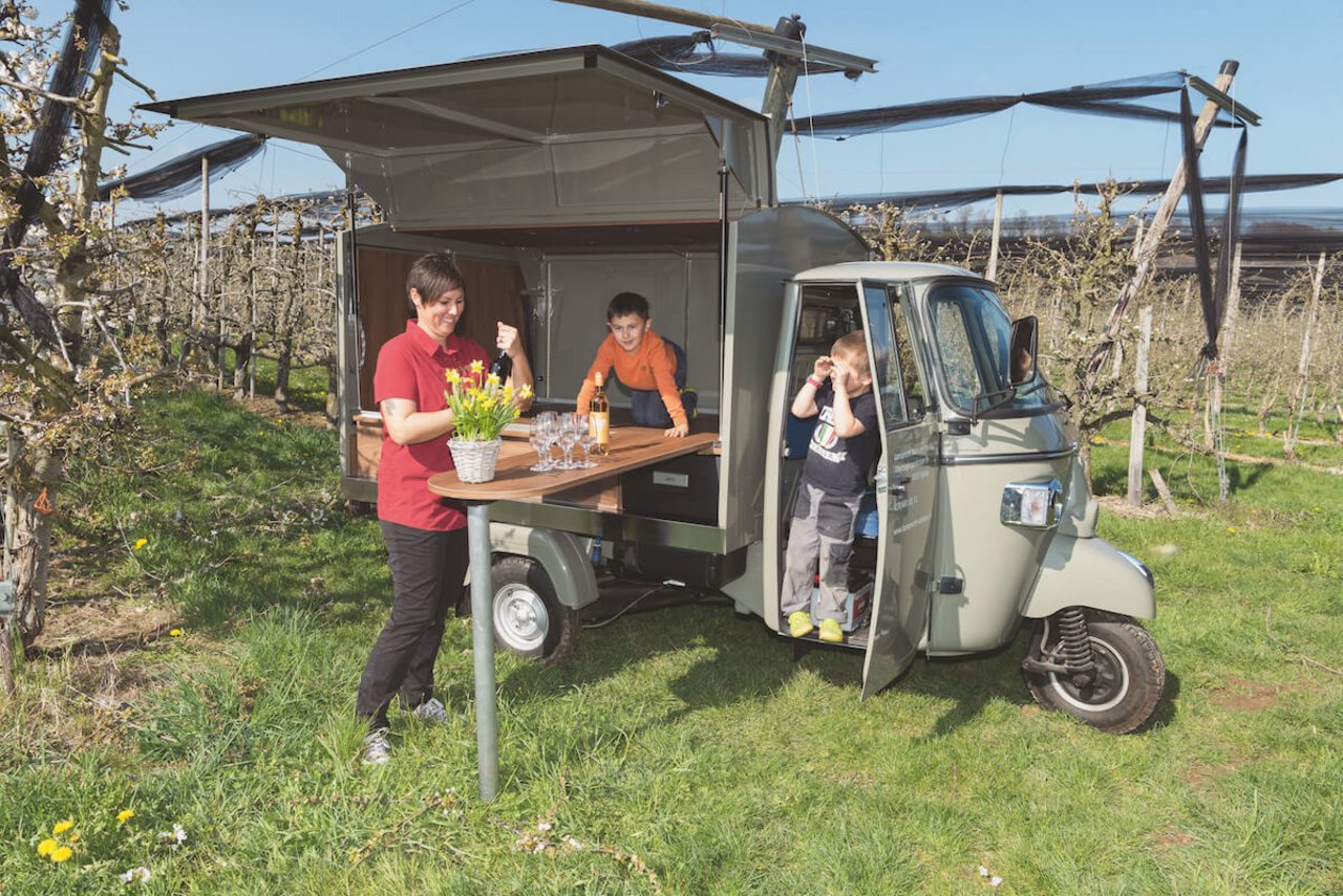 Bei den Obstplantagen offenbart der Klassiker, der seit 1948 produziert wird, seine innere Schönheit. Amina Lamprecht klappt die Seitenwand mit dem Logo nach oben, hängt eine Tischplatte ein, öffnet Schubladen, stellt Gläser und Weinflaschen auf, zaubert mit wenigen Handgriffen eine Bar aus dem ausgeklügelten Innenleben ihrer Ape.