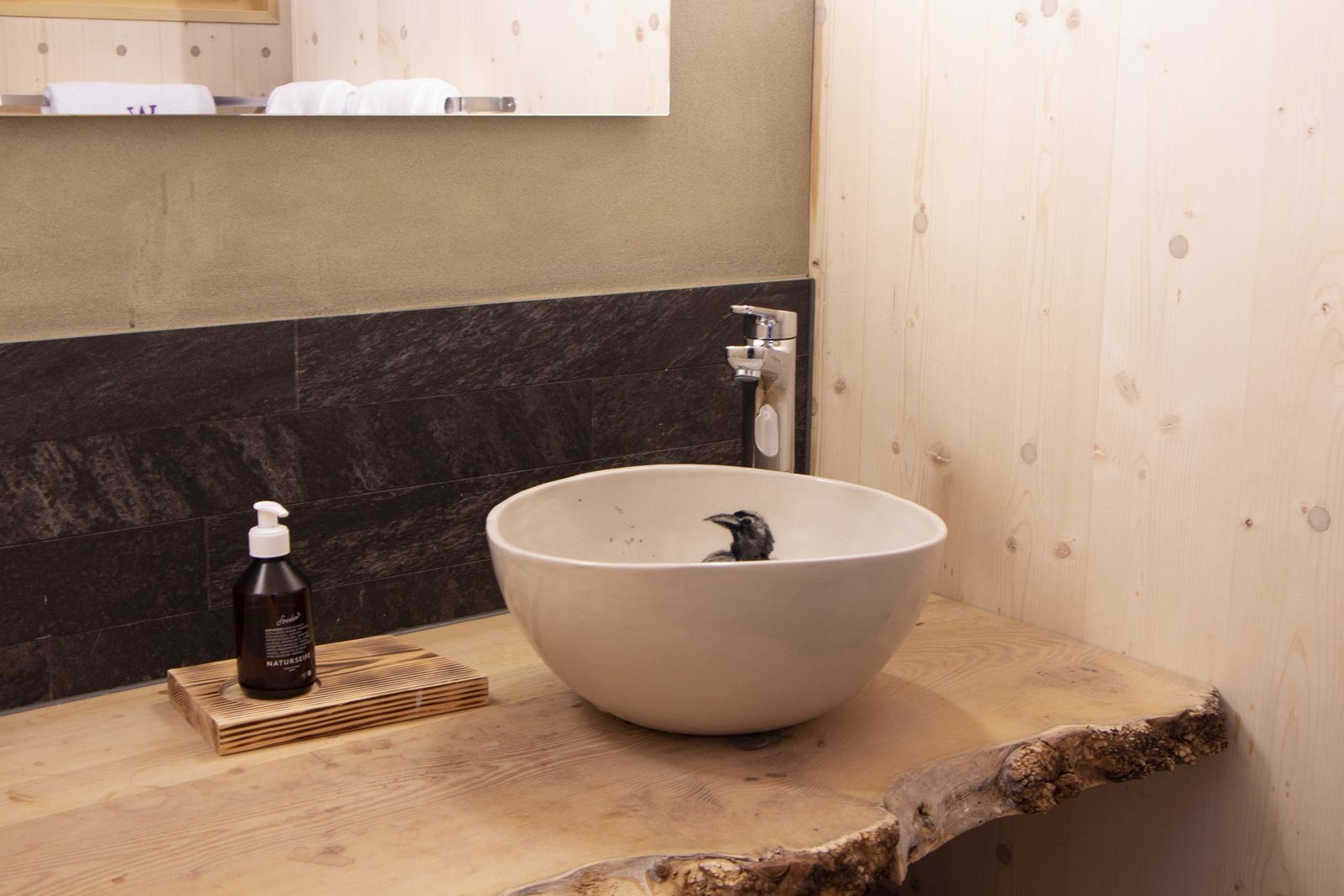 Im Hotel-Lavabo sitzt eine Krähe. Und das Zimmer riecht. Andernorts marschiert der Gast in so einem Fall zurück an die Réception und reklamiert. Bei den Mondholz-Zimmern des Hotel Waldhaus auf der Bettmeralp (Wallis) gehört das zum Konzept.[IMG 5] Individuelle Details: Jedes Lavabo ziert ein anderes handgezeichnetes Sujet. Die Waschtische sind zudem alle aus einem anderen Holz. «Ich habe die Natur ins Hotel geholt»,…