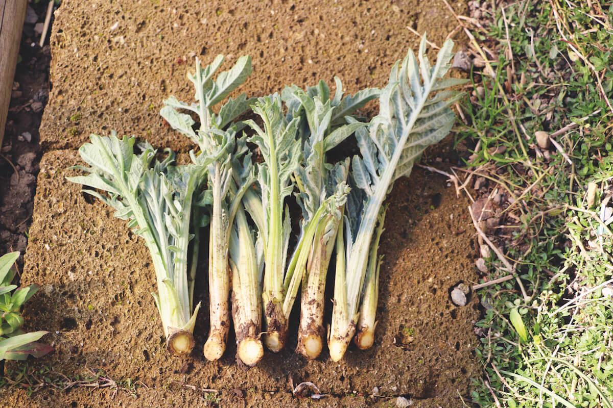 Dazu wird entweder die ganze Pflanze auf dem Feld mit schwarzer Folie oder Wellkarton eingewickelt, oder man gräbt sie samt Erdballen aus und bleicht sie zwei bis drei Wochen lang in einem dunklen Raum. Nachdem die Stängel gebleicht sind, schneidet man die stacheligen Ränder weg und zieht die gröberen Fasern ab.