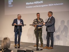 Bereits die Eröffnung der Suisse Tier 2023 war für die Verantwortlichen eine runde Angelegenheit. Nach Geleitworten von Messebeirats-Präsident Meinrad Pfister tauschte sich Markus Höltschi, Prorektor des BBZN Hohenrain, mit den Landwirten Thomas und Marc Grüter vom Sonnhaldenhof in St. Urban LU zum Messe-Thema Effizienz aus. Im Anschluss verlieh die Schweizer Agrarmedien AG, zu der die BauernZeitung und das Fachmagazin «die grüne» gehören, drei Spezialpreise für herausragende gewerbliche Neuheiten und zeichnete drei findige bäuerliche Tüftler für ihre Innovationen aus.