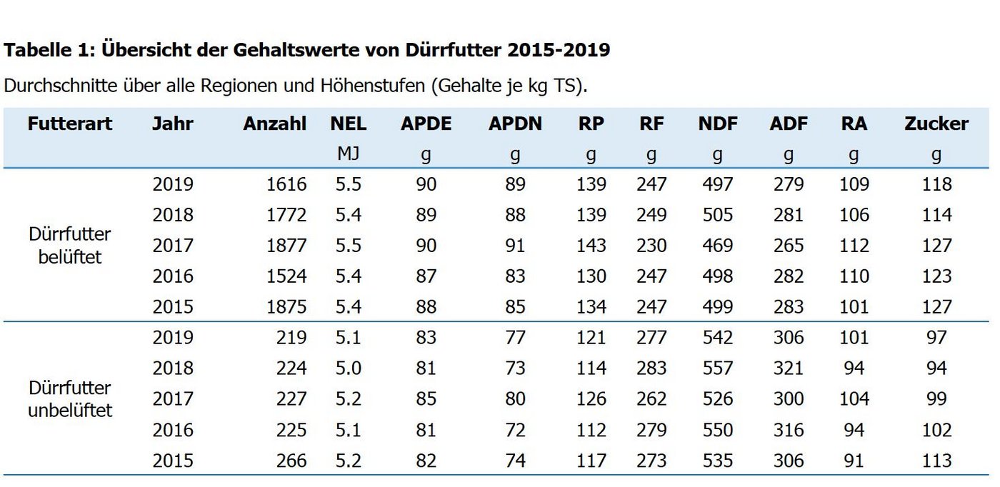Die Auswertung des Dürrfutters 2019 basiert auf rund 2400 eingesandten Proben bei der UFAG AG und Eurofins Scientific AG. Die Daten der Dürrfutter-Enquête 2019 fliessen in die Schweizerischen Futtermitteldatenbank Feedbase und können dort abgerufen werden.