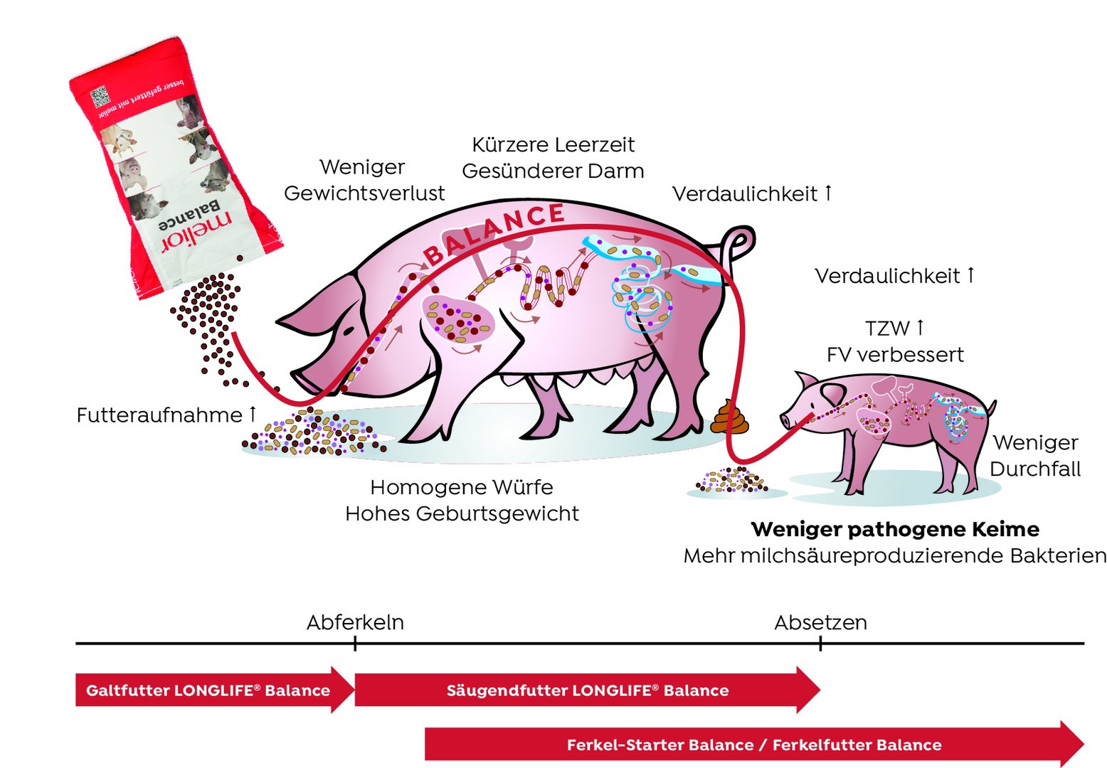 Das melior-Konzept Balance unterstützt in allen Phasen. Probiotische Sporenbildner im 3222 Galtfutter LONGLIFE® Balance und 3272 Säugendfutter® LONGLIFE Balance stabilisieren die Verdauung, hemmen pathogene Keime und stärken die Darmbarriere. So bleibt der Stoffwechsel entlastet, die Fruchtbarkeit gesichert und der Infektionsdruck im Bestand niedrig.