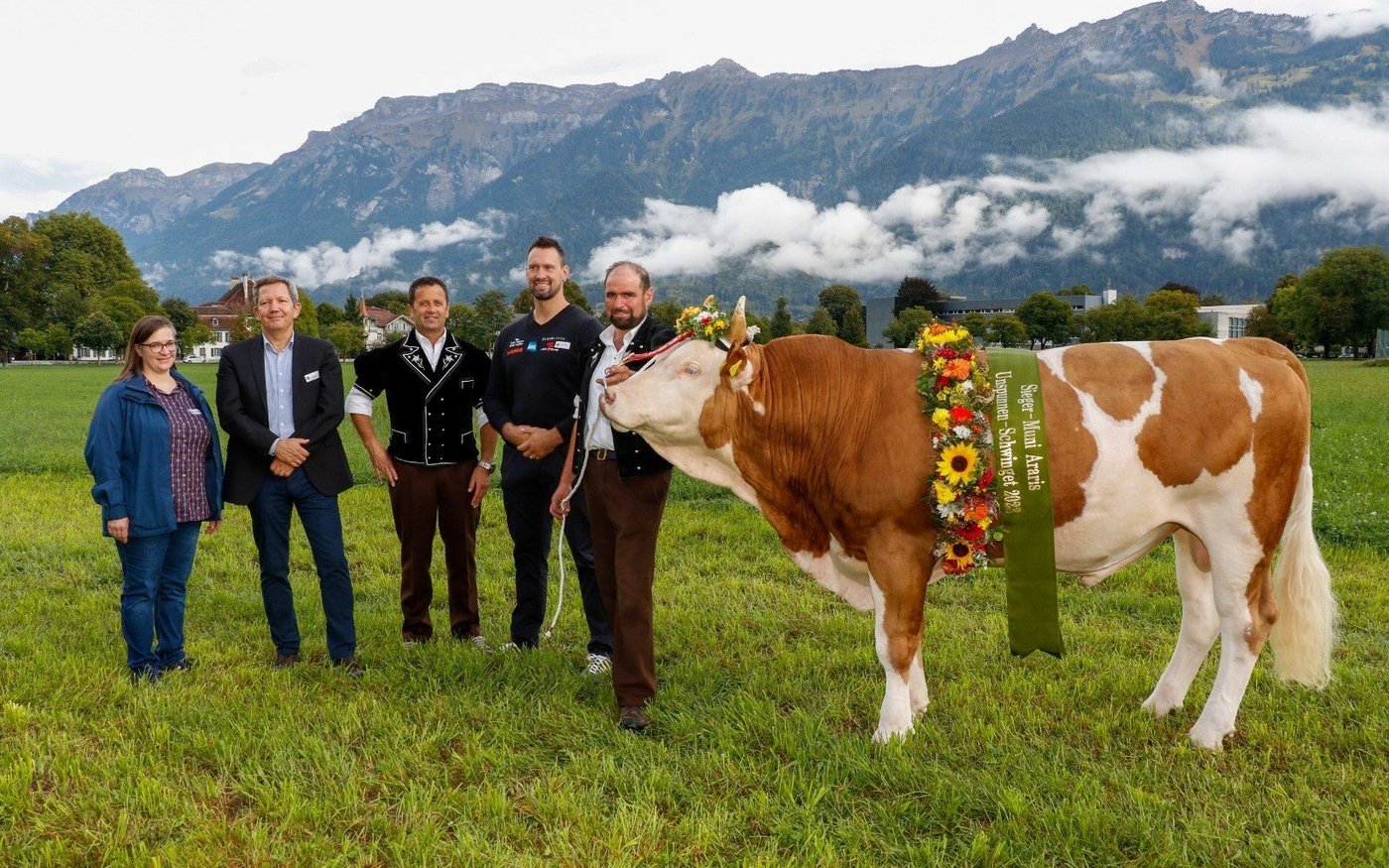 Mit von der Partie war auch Kilian Wenger, der als Taufpate amtete. Der Schwingerkönig von 2010 überragte zwar die anderen Anwesenden, aber der bereits 600 kg schwere Aararis wirkte trotzdem alles andere als klein neben Wenger. Bis zu seinem Auftritt im nächsten Jahr wird der Siegermuni aus dem Stall von Andrea und Hansueli Abersold in Beatenberg BE gut 1000 kg wiegen.