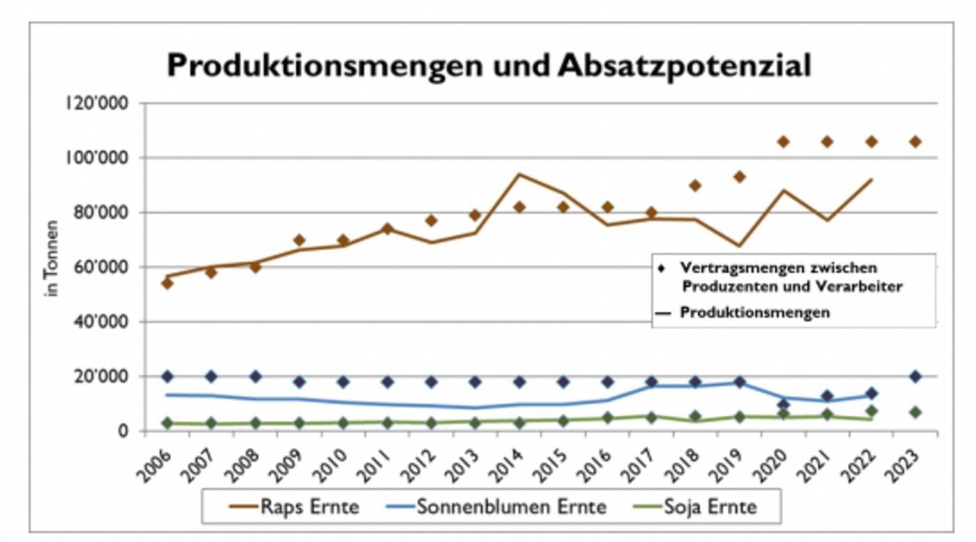 In Sachen Ölsaaten herrsche eine erfreuliche Situation, sagte Rahel Emmenegger von der SGPV-Geschäftsstelle. Durchschnittlich seien knapp 37 kg Raps/a geerntet worden. Die Produktionsmenge hat gegenüber 2021 (77'073 t) im Jahr 2022 mit 92'000 t klar zugelegt. Die Vertragsmenge von 106'000 t konnte allerdings nicht erreicht werden. Dies nicht zuletzt auch wegen der zunehmenden Einschränkungen des Pflanzenschutzmittel-Angebots.