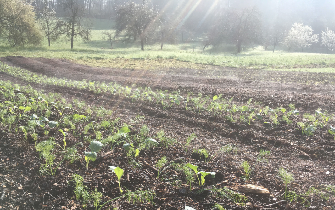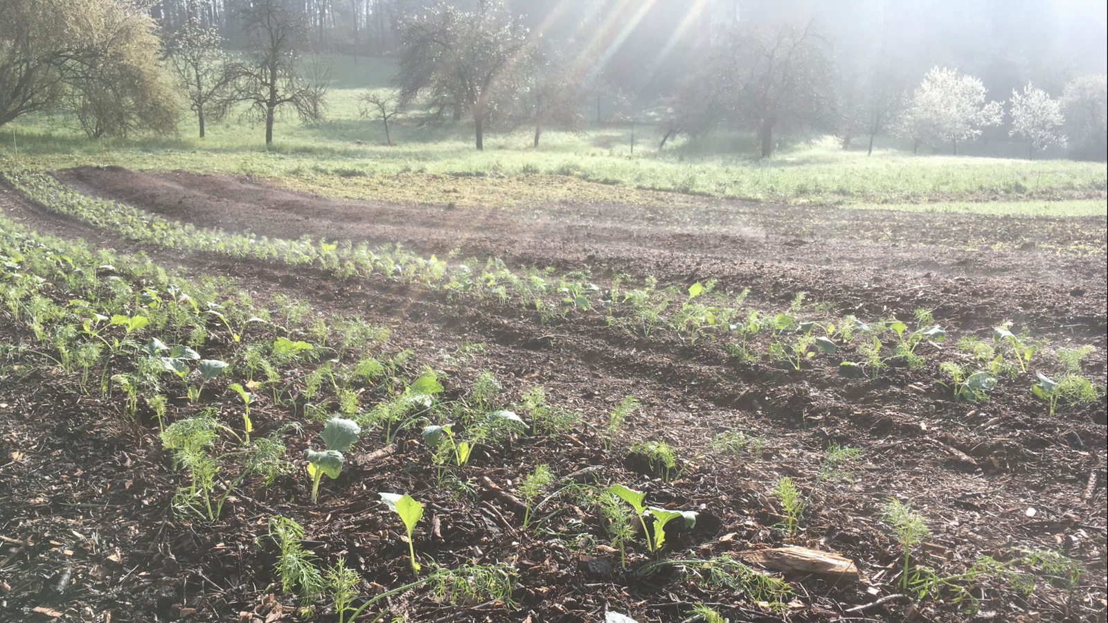 Seit acht Jahren wird bei SlowGrow experimentiert, und zwar auf einer eigens dafür reservierten Fläche, dem «Hoflabor». Bevor neue Methoden grossflächig zum Einsatz kommen, werden sie dort getestet und weiterentwickelt. Den Mulch für die Gemüsebeete gewinnen Matthias Hollenstein und Samuel Bähler ebenfalls auf separaten Parzellen, um ihn dann zwischen den Pflanzen zu verteilen. Der Boden sei hier bis in 20 cm Tiefe schön krümelig, Hollenstein spricht von «Gartenerde mitten auf dem Feld». Das Ziel der Betriebsleitenden sind nicht nur gute Erträge ohne Pflanzenschutzmittel und Dünger von aussen, sondern ebenso skalierbare Methoden, die auch auf anderen Höfen funktionieren.