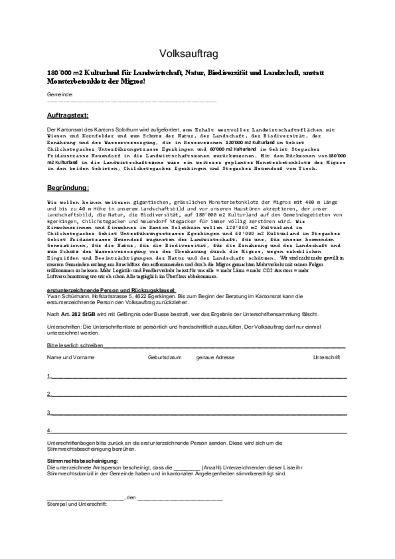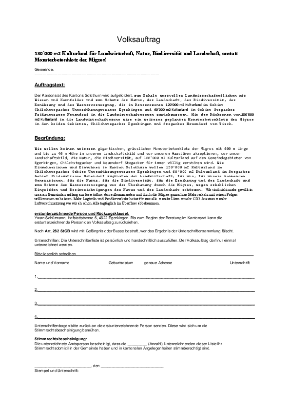 Im Gäu im Kanton Solothurn ist das Unverständnis über den geplanten Erweiterungsbaus des Migros-Verteilbetriebes weiterhin gross. Nun haben Egerkinger Einwohner eine Unterschriftensammlung mit Volksauftrag lanciert. Der Kanton Solothurn wird in diesem Volksauftrag aufgefordert «zum Erhalt wertvoller Landwirtschaftsflächen mit Wiesen und Kornfelder und zum Schutz der Natur, der Landschaft, der Biodiversität, der Ernä…