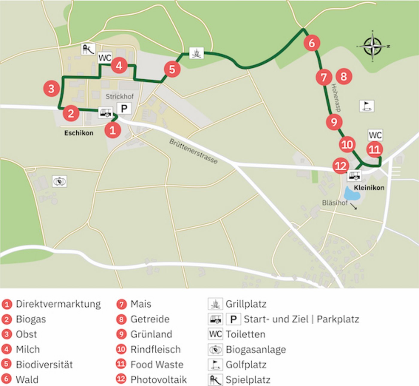 Auf einer Strecke von 2,5 Kilometern, die vom Strickhof Lindau bis zum Golfplatz im Weiler Kleinikon bei Winterberg teilweise durch den Wald führt, werden derzeit zwölf verschiedene Posten eingerichtet. Jeder ist einem landwirtschaftlichen Thema gewidmet, von Direktvermarktung über Mais und Food Waste bis zu Photovoltaik. Bei Station 10 zum Beispiel geht es um die standortgerechte Rinderaufzucht. Dazu sind auf der dazugehörenden Tafel einige Informationen zu entnehmen, etwa zur Fütterung sowie klimatischen Aspekten.