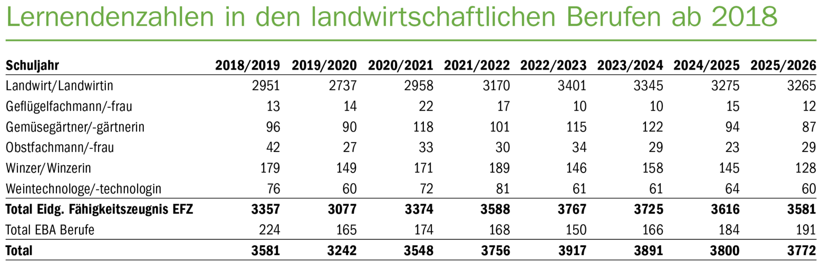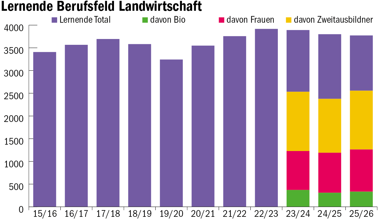 Derzeit befinden sich 3581 Lernende in Ausbildung für ein EFZ in einem landwirtschaftlichen Beruf, wie die Organisation der Arbeitswelt (OdA AgriAliForm) in einer Medienmitteilung schreibt. Das sind etwas weniger als im Vorjahr (3616). «Solange es nur ein leichter Rückgang ist, werden wir noch nicht nervös – leichte Schwankungen gehören dazu», sagt Petra Sieghart, Leiterin Bildung beim Schweizer Bauernverband (SBV)…