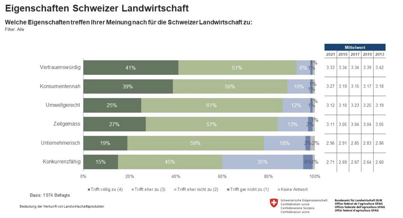 Die Umfrage des BLW beschäftigte sich auch damit, wie die befragten Konsumentinnen und Konsumenten die einheimische Landwirtschaft beurteilen. Die Ergebnisse sind erfreulich: