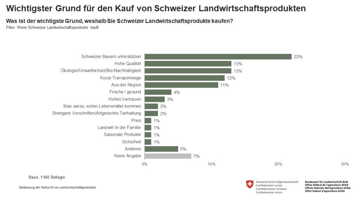 Gemäss der Umfrage geben satte 93 Prozent der Teilnehmenden an «wenn immer möglich» Schweizer Landwirtschaftsprodukte zu kaufen. Als wichtigste Gründe für die Bevorzugung inländischer Ware wird die Unterstützung der Schweizer Bauern und die hohe Qualität der Produkte genannt, gefolgt von einem Zusammenzug aus Ökologie / Umweltschutz / Bio und Nachhaltigkeit.