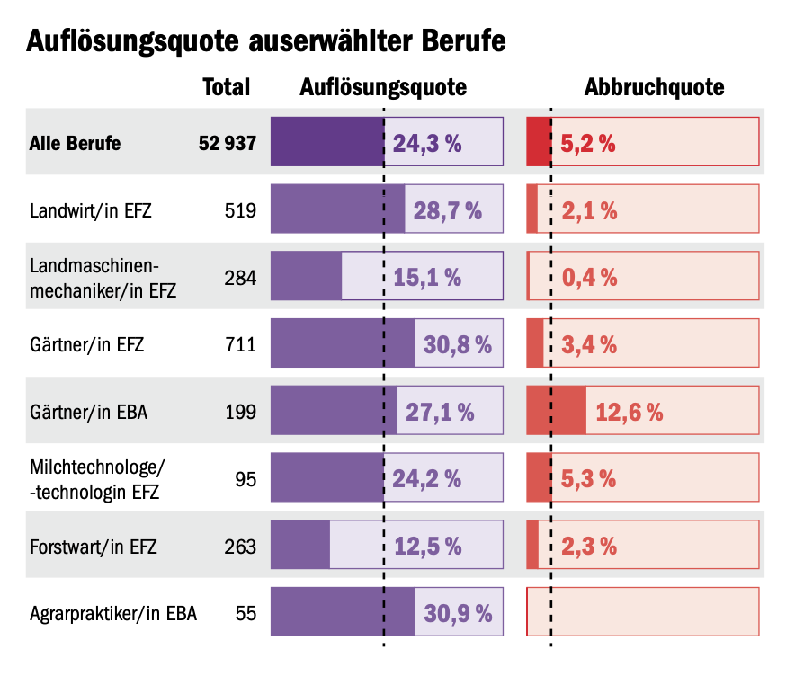 Branchenkennerinnen wissen aber, dass praktisch niemand die Landwirtschaftslehre abbricht, weil ihm der Beruf nicht gefällt. Es würden einfach bewusstere Entscheide getroffen als in anderen Berufen mit den wirklich hohen Abbruchquoten, so die Interpretation des SBV. Denn laut dem Bundesamt für Statistik machen von diesen «Abbrechern» knapp 90 % auf einem anderen Betrieb weiter. Und das ist ja eigentlich eine gute Nachricht, wie die Bildungsverantwortliche des SBV die Zahlen deutet.