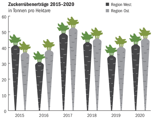 Die erste Ernteerhebung ergab 42,2 t (Region West) bzw. 45,9 t (Region Ost) Rüben je Hektare. Die Erträge liegen damit über denen von 2019 und können noch wachsen. (Grafik BauZ, Quelle SZU)