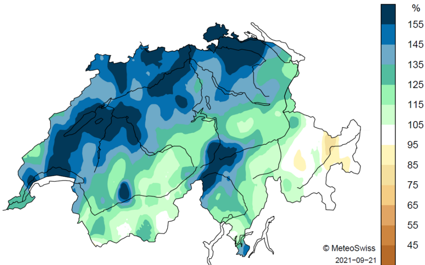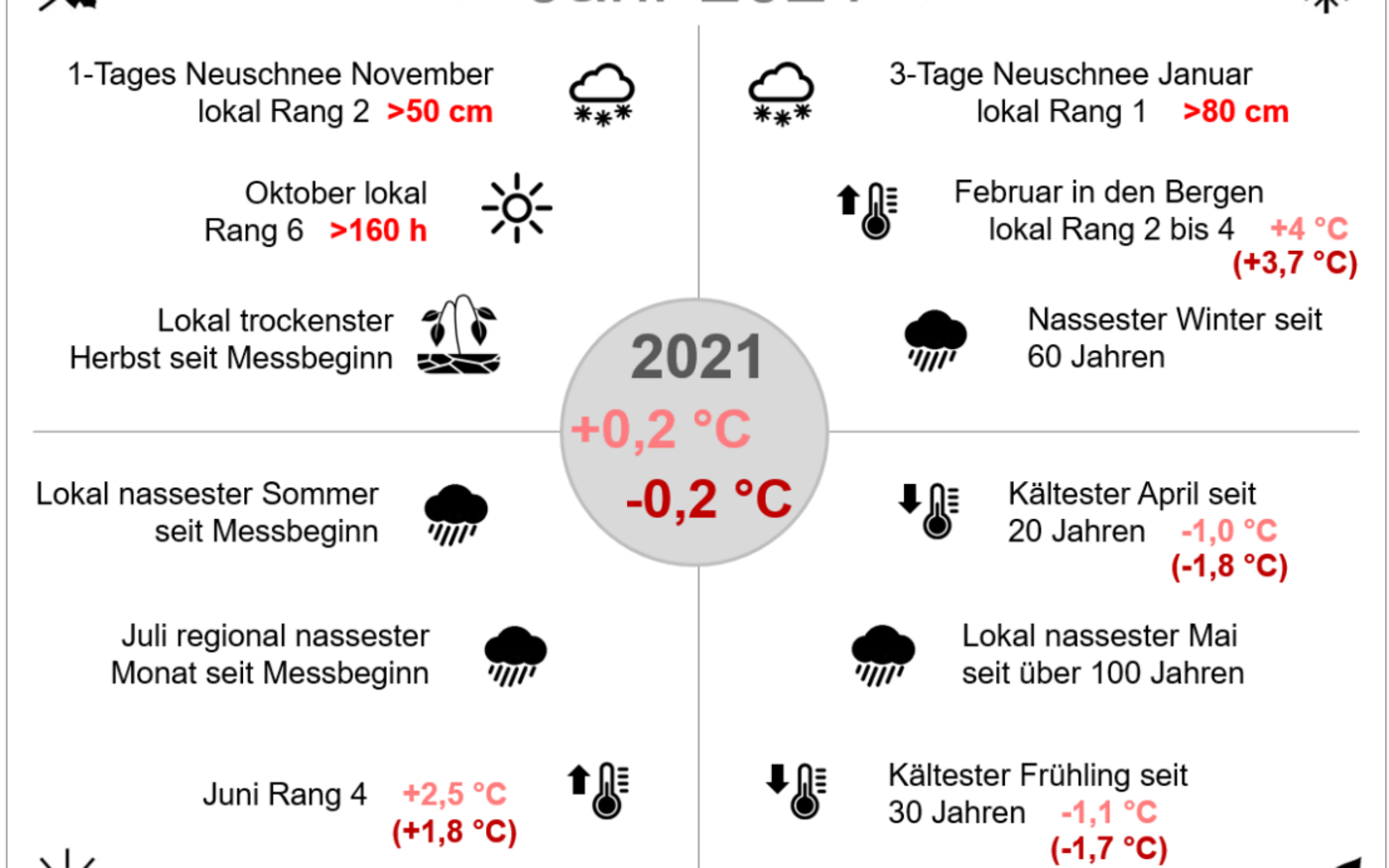In ähnlichem Stil ging es in den Frühlingsmonaten weiter. Laut MeteoSchweiz erlebte die Schweiz das kälteste Frühjahr seit über 30 Jahren. Ab Mai gab es viel Regen. Der Sommer 2021 gilt als einer der nassesten seit Beginn der Aufzeichnungen, es gab aber wenige Hitzetage und blieb im Durchschnitt vergleichsweise kühl. Je nach Region wurden Regenmengen bis 190 Prozent des üblichen Werts gemeldet. Nördlich der Alpen führten die ständigen Niederschläge gegen Mitte Juli zu Hochwasser und Überschwemmungen.