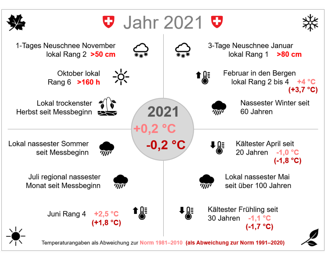 Zwar ist die Erhöhung der durchschnittlichen Jahrestemperatur 2021 klein (0,2 Grad gegenüber der Norm von 1981 bis 2010) und verglichen mit der Periode 1991 bis 2020 sogar leicht unterdurchschnittlich, in letzterer Norm ist aber bereits eine Erwärmung um 0,5 Grad gegenüber der vorindustriellen Zeit eingerechnet, wie MeteoSchweiz schreibt.