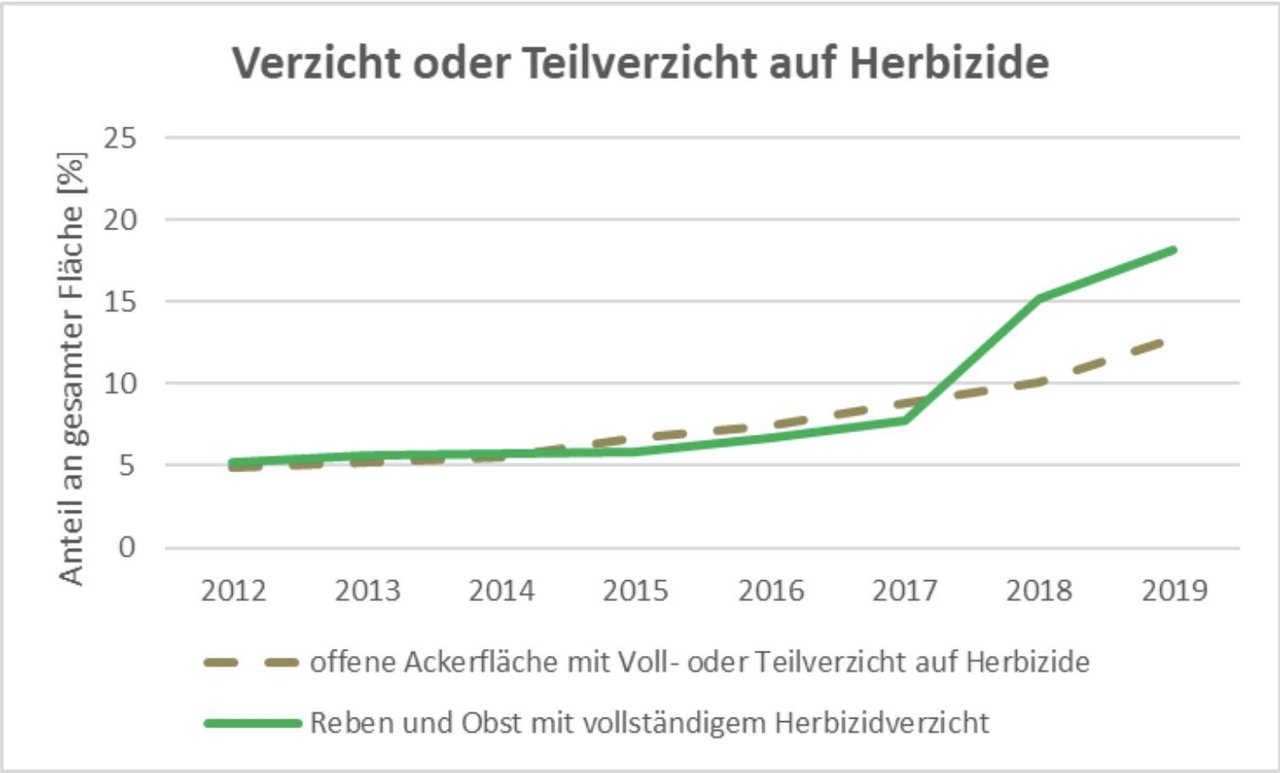 Im Vergleich zum Jahr 2018 wurden laut dem BLW 20 Prozent mehr der Obst-, Reb- und Ackerfläche ohne oder mit einem Teilverzicht auf Herbizide bewirtschaftet. Die Anreize über Direktzahlungen, um den vermehrten Einsatz mechanischer Unkrautbekämpfung zu fördern, scheinen zu wirken.
