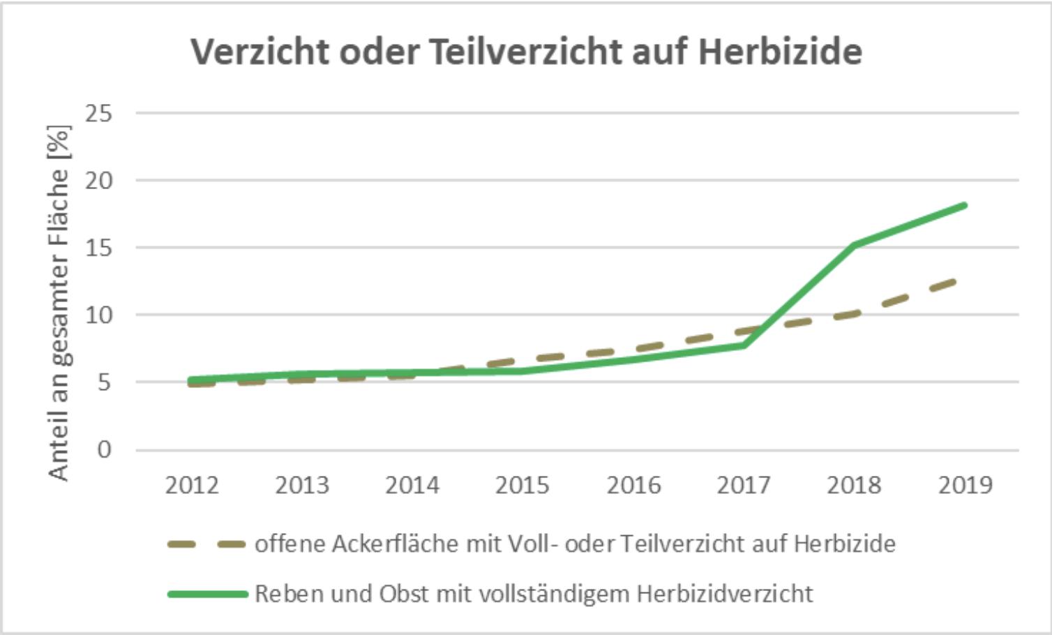 Insgesamt wurden 2019 18% der Obst- und Rebflächen ohne Herbizide und 13% der offenen Ackerflächen ohne Herbizide oder mit Teilverzicht bewirtschaftet. (Grafik BLW)
