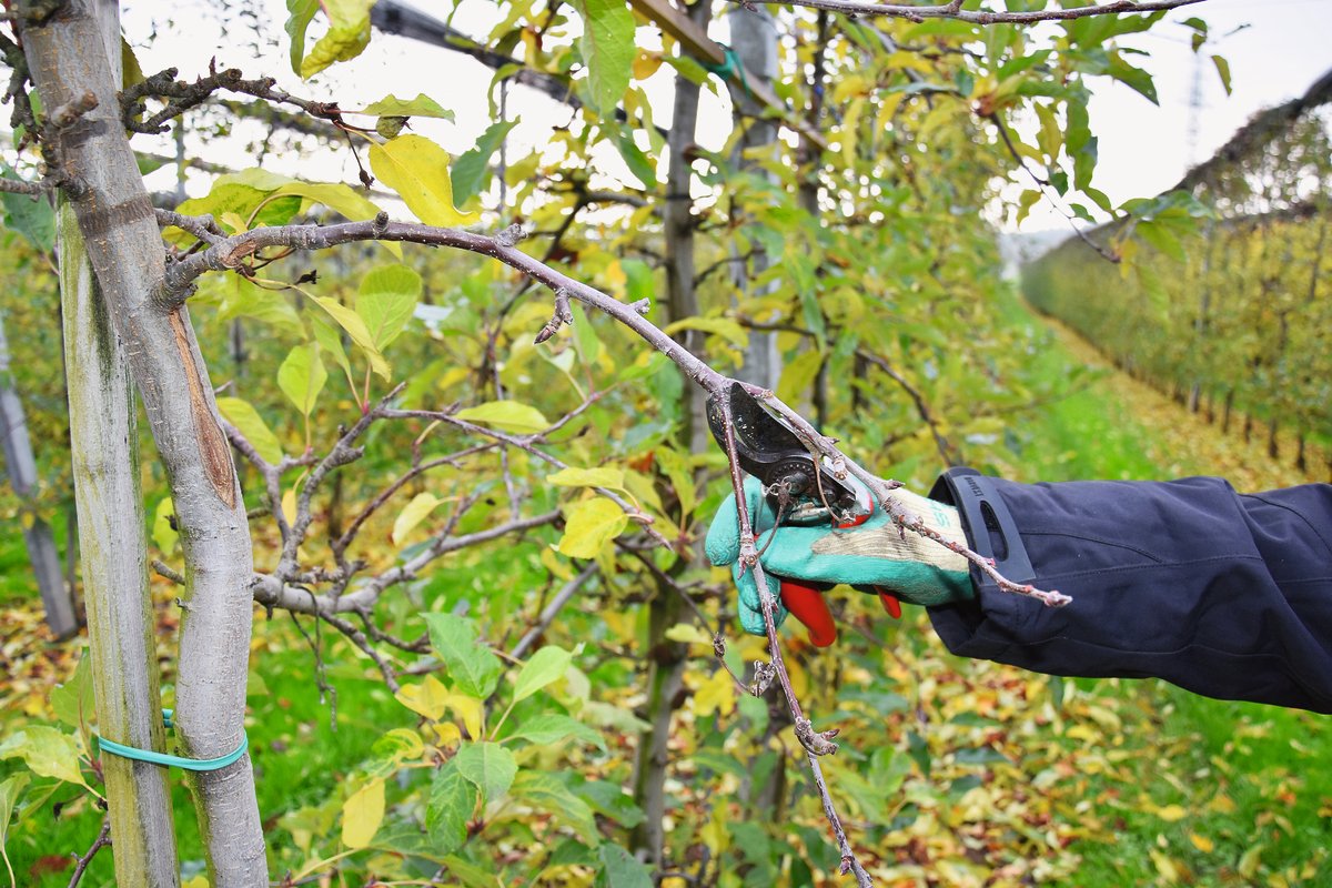 Ab November bis April steht wieder der Winterschnitt für Niederstamm-Obstbäume an. Idealerweise, wenn das gesamte Laub abgefallen ist, um erkennen zu können, wo Knospen gebildet wurden und wie die Triebe wachsen. Mit dem Schnitt sollte man es aber nicht übertreiben. Denn wird zu stark zurückgeschnitten, schiesst der Baum in die Höhe, anstatt Blüten und Früchte zu bilden. Nach einem Winterschnitt sollten sich noch etwa 200 bis 300 starke Knospen am Baum befinden für rund 100 bis 150 Früchte (inkl. Verlust durch Frost und nach der Qualitätsausdünnung im Frühjahr).