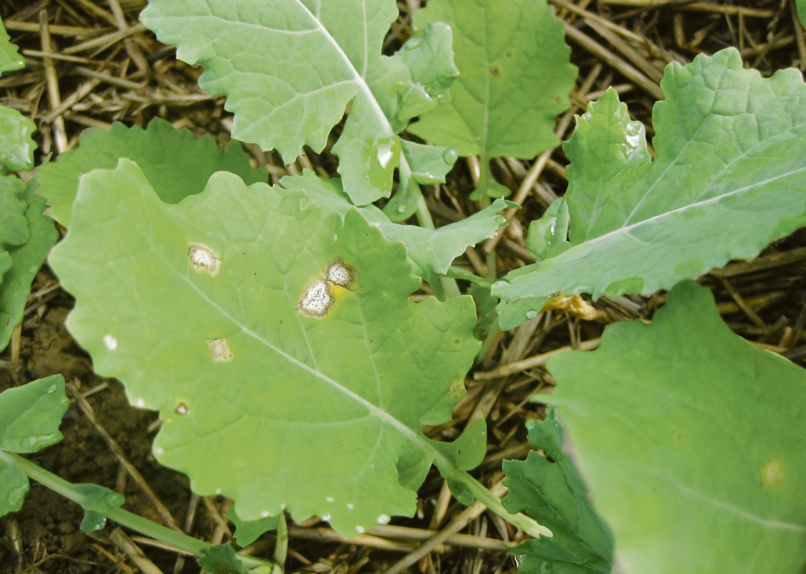 Die Wuzelhals- und Stängelfäule (Phoma) im Winterraps kann ab dem 4-Blattstadium an den graubeigen Blattflecken mit schwarzen Punkten in der Mitte erkannt werden. Indirekt wird die Pilzkrankheit durch das Einarbeiten von Rapsstroh und die Zerstörung von Ausfallraps bis spätestens vor dem Auflaufen der neuen Saat bekämpft.