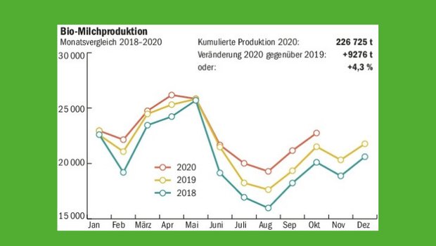 Die Nachfrage nach Bio-Milchprodukten wachse seit Jahren und stand 2019 bei einem Anteil von 13,6 Prozent am gesamten Milchmarkt. Durch die Pandemie dürfte der Marktanteil laut Bio Suisse nochmals gestiegen sein. Diese hohe Nachfrage sei weiterhin ungebrochen. So blieben auch die Tiefkühllager für Bio-Butter in den ersten Januarwochen leer, heisst es weiter. Ob dieser starke Absatz die Corona-Pandemie überdauere, sei jedoch schwer abschätzbar, denn der Bio-Milchmarkt sei zurzeit «sehr volatil», so Bio Suisse.