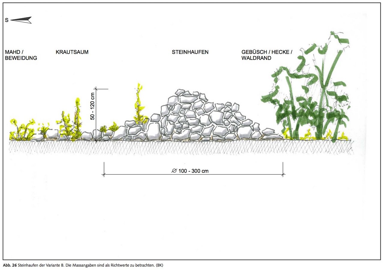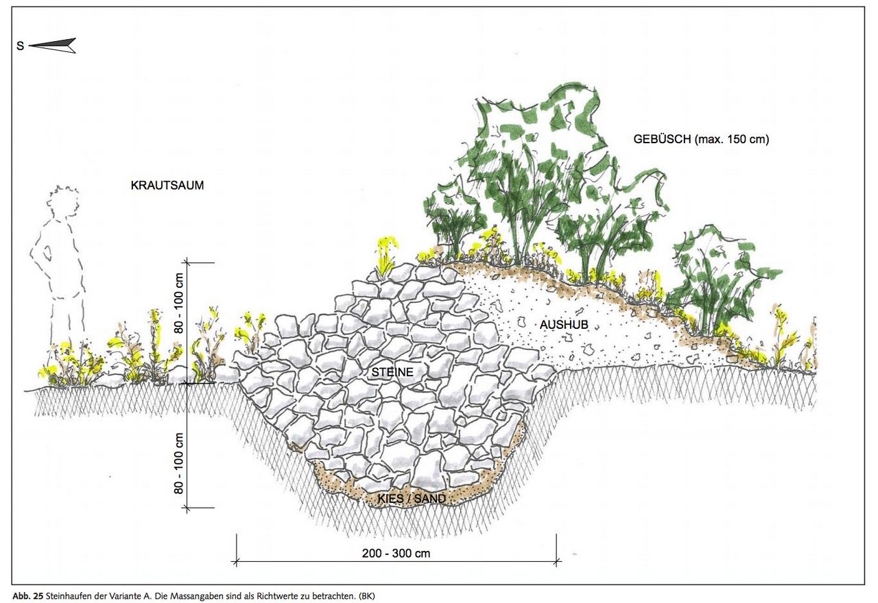 Insekten, Spinnen, Schnecken, Mäuse, Wiesel und Eidechsen, sie alle haben in modernen Anbaugebieten Mühe, einen geeigneten Unterschlupf oder ein Winterquartier zu finden. Ihnen zu helfen ist für einmal gar nicht so schwer; aufgehäufte Steine aus der Region genügen. Ein Merkblatt der Koordinationsstelle für Amphibien- und Reptilienschutz in der Schweiz (Karch) listet die wichtigsten Punkte dazu auf. Hauptsache besonnt…