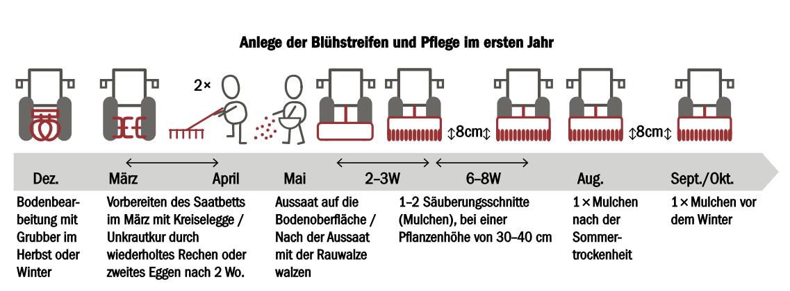 Die Aussaat der Blühstreifenmischung sollte zwischen Mitte April und Ende Mai erfolgen. Bei ausreichendem Niederschlag würde so bereits ein Teil der Pflanzen vor dem Eintritt der Sommertrockenheit keimen. In Regionen mit häufigen und langen Trockenperioden im Frühjahr kann die Aussaat im Herbst nach der Obsternte erfolgen. Eine späte Aussaat ermöglicht auch eine Bodenbearbeitung im Sommer, wodurch mehrjährige Unkräuter und das Nachwachsen von Gräsern reduziert werden. Auch folgende Schritte beachten: