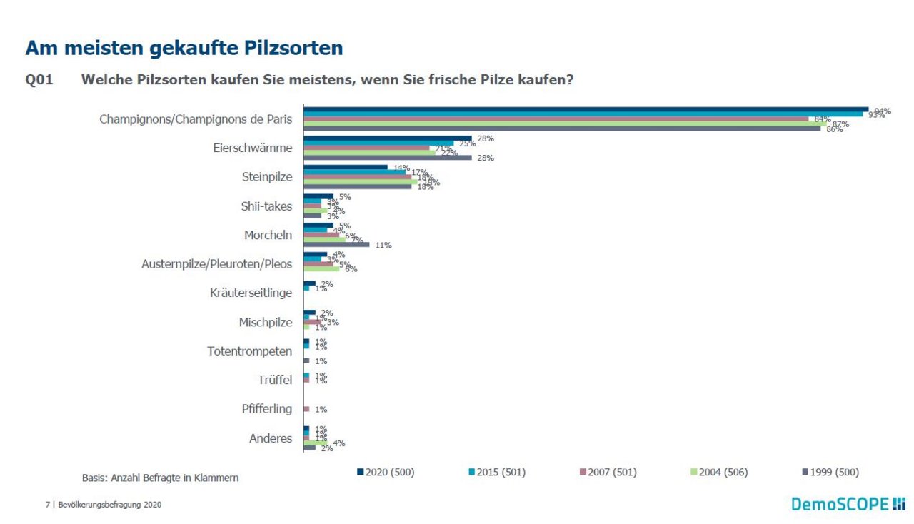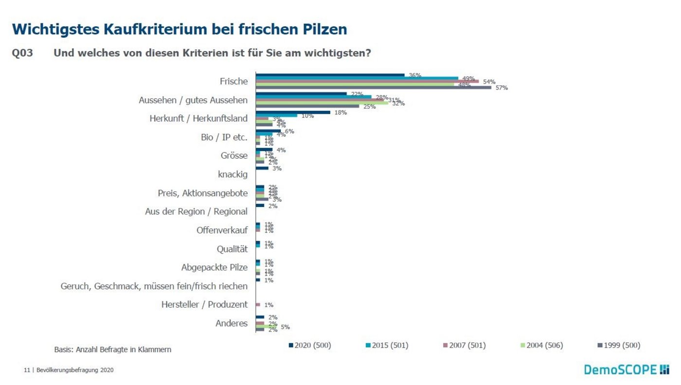 Die wichtigsten Kaufkriterien seien dabei Frische, Aussehen und Herkunft, so der VSP. Während Frische und Aussehen etwas an Bedeutung verloren haben, achten die Konsumenten deutlich mehr auf die Herkunft der Pilze und bevorzugen mehr Label-Produkte.