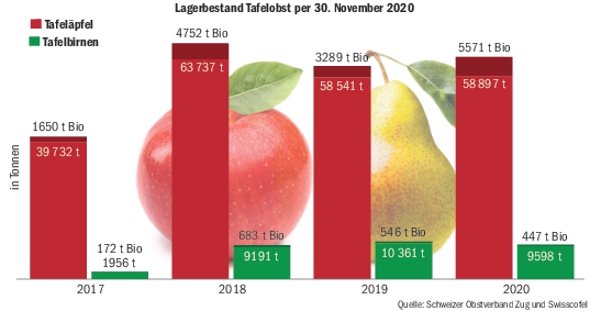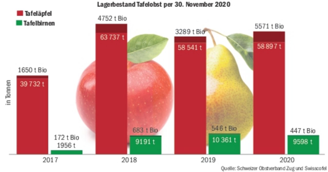 Die Tafelobst-Ernte 2020 war gut. Nur leider war der Absatz laut den Zahlen von Schweizer Obstverband (SOV) und Swisscofel (Vereinigung des Obst-, Gemüse- und Kartoffelhandels) im November von rund 6000 Tonnen (t) Tafeläpfel und rund 1900 t Tafelbirnen schwach. Verkauf im grünen Bereich Beatrice Rüttimann vom SOV kommentiert die November-Verkäufe so: «Die Apfelverkäufe vom November sind vergleichbar mit denen von…