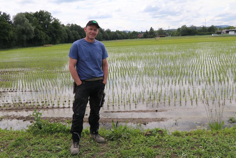 Frösche quaken und Libellen schweben im Tiefflug über das Wasser. Überall strecken Reispflanzen ihre Stängel aus dem seichten Wasser. Nein, wir befinden uns nicht in Asien, sondern in der Nähe von Brugg im Kanton Aargau. In Lauffohr wird bereits zum zweiten Mal Reis im Nassanbau angepflanzt. Toni Suter, Bereichsleiter bei Schwarz Gemüsebau in Villigen ist für dieses besondere Projekt zuständig. Zielstrebig geht er näher an das geflutete Feld heran. Rechts und links von ihm hüpfen Frösche davon. «Ich bin wirklich beeindruckt von der Biodiversität, die sich hier bereits entwickelt hat», sagt er.