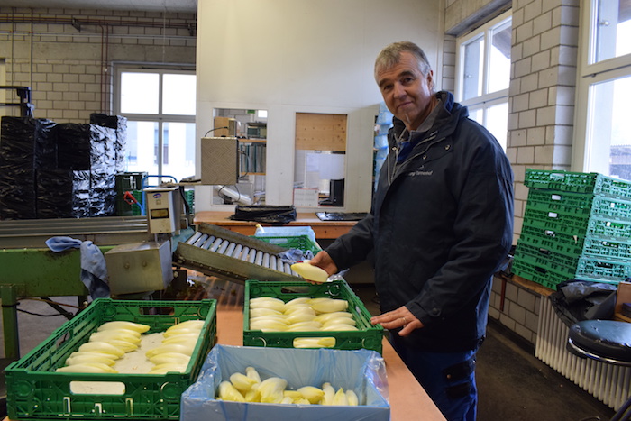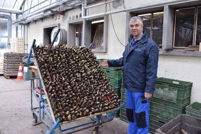 In der bis zu 13 Grad temperierten Treiberei verbringen die Wurzeln bis zu 28 Tage. Schon bald spriessen aus dem dunklen Wurzelstock die Blätter. Ist der hellgelbe Spross voll ausgewachsen, wird die Wurzel abgeknickt.