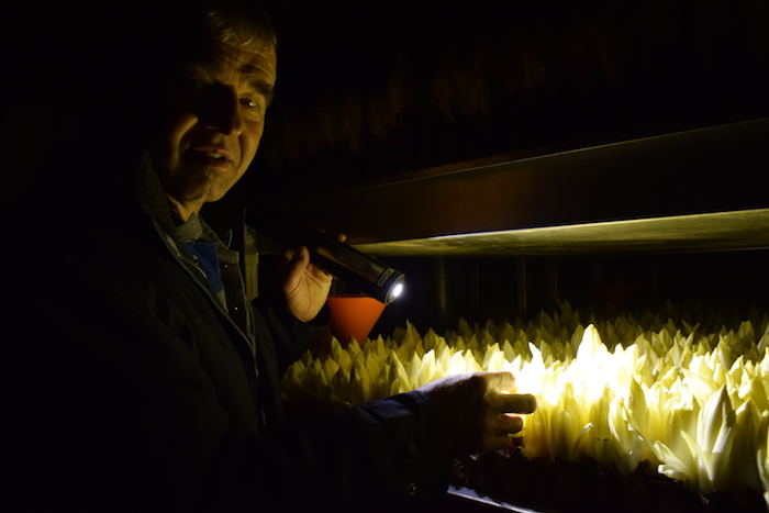 Soll nun der Chicorée spriessen, kommen die Wurzeln in die Treiberei. In absoluter Dunkelheit und in Wannen mit gut temperiertem Wasser gestellt, lagern sie reihenweise in grossen Regalen. Dass der Chicorée in der Finsternis wächst hat einen guten Grund: würden die Blätter grün, würde er zu bitter. Die heutige Zucht der gelben Zapfen ist meist bitterarm. Der dunkle Raum, in dem die feinen, hellgelben Chicoréeblätter aus den Wurzeln spriessen, ist klimagesteuert und der mit Sauerstoff angereicherte Wasserkreislauf durch die Reihen sorgt für eine feuchtwarme Atmosphäre. Es sprudelt und brodelt wie in einem Spa.